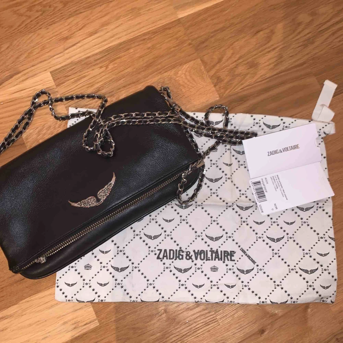 Svart zadig & Voltaire väska i bra skick, ena grejen på dragkedjan har gått av men facket går fortfarande att öppna och stänga. Färgen på märket har skavts av lite. Inköpt i somras 2019. Nypris 3400kr