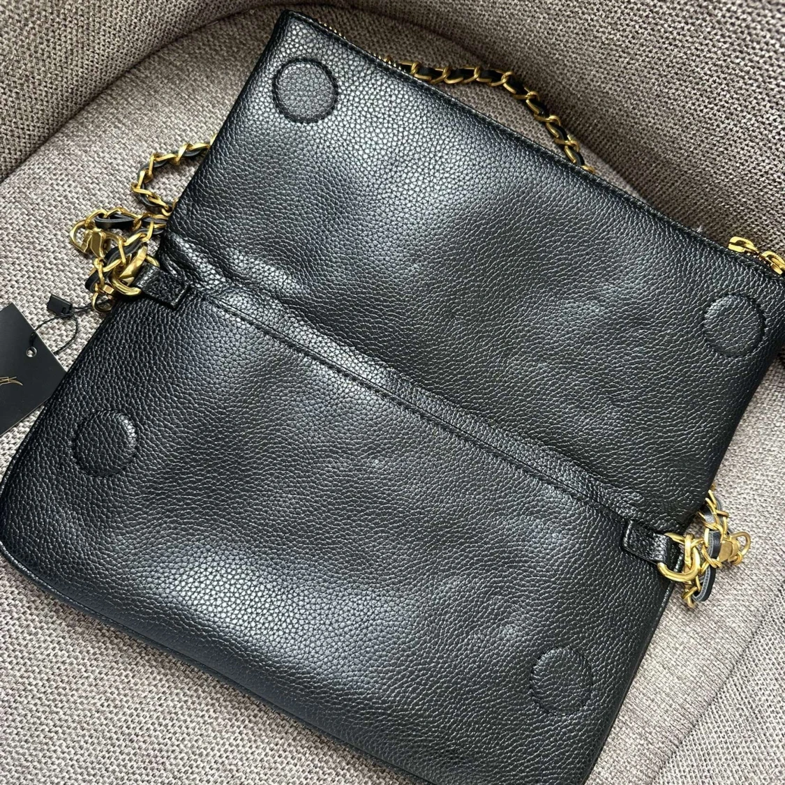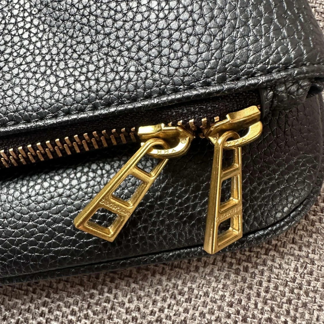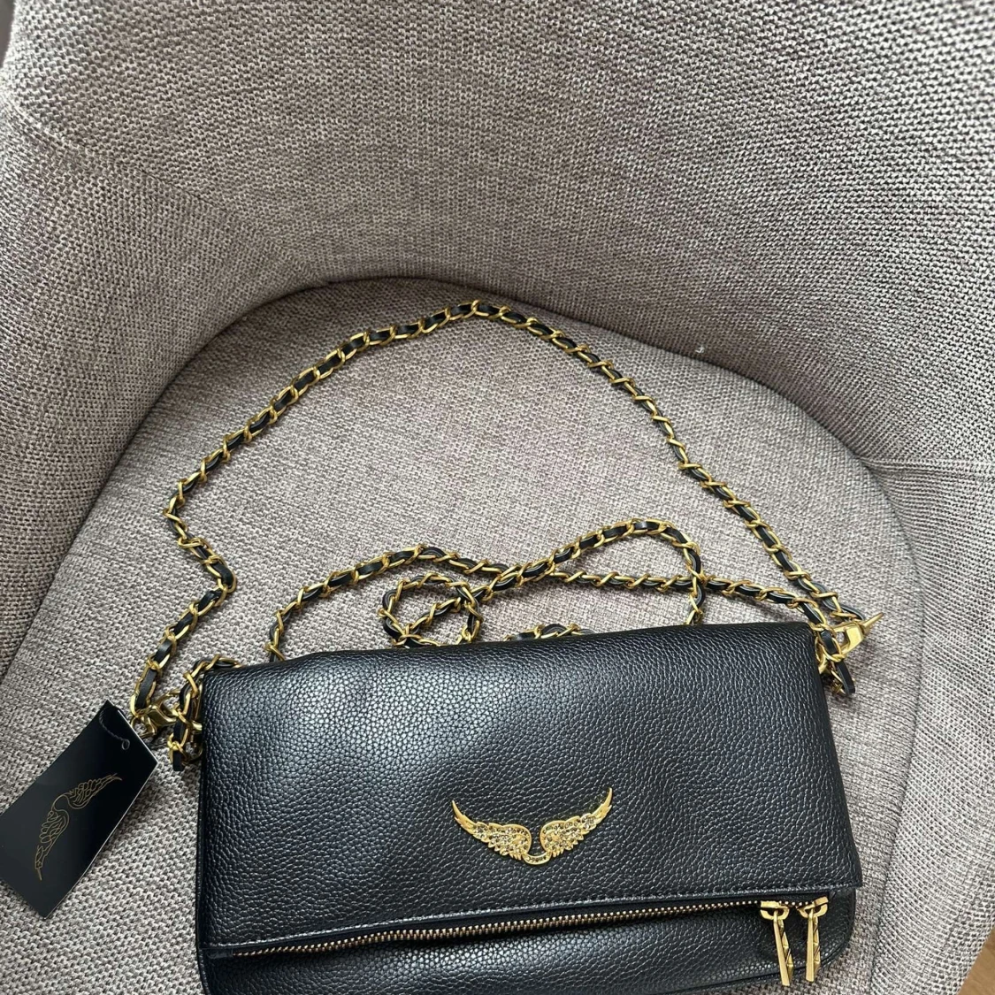 Snygg svart axelväska i präglat skinn från Zadig & Voltaire med guldfärgade kedjedetaljer och dragkedja. Väskan har ikoniska vingar framtill och coola dubbla dragkedjor. Perfekt storlek för det viktigaste och ger en edgy vibe till din outfit.