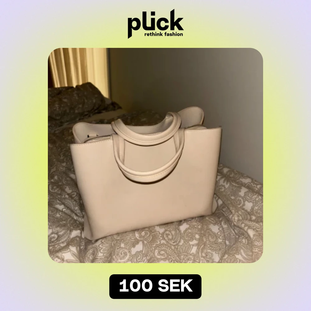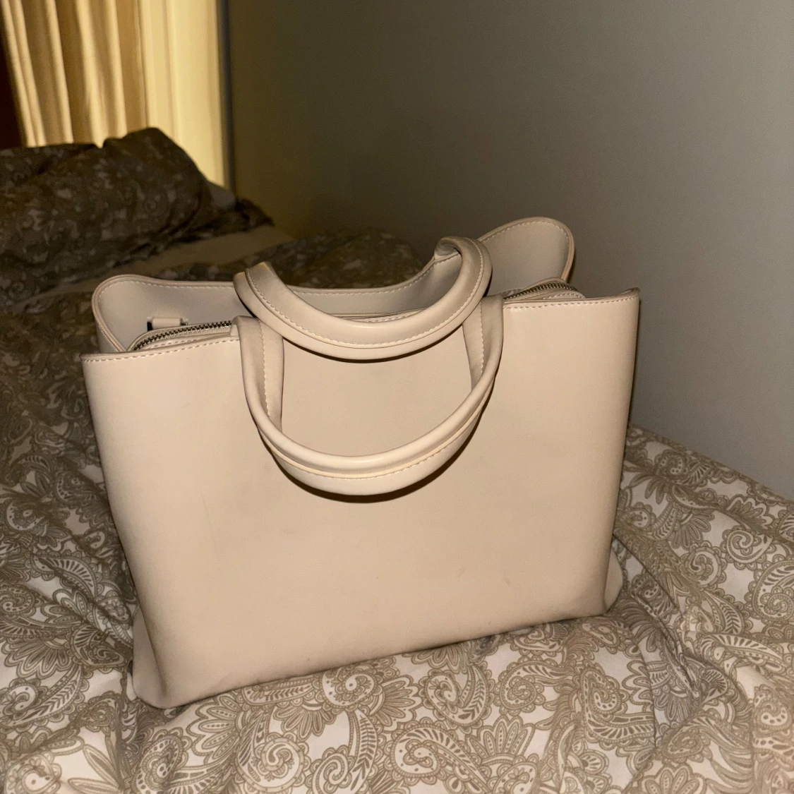 Beige handväska som kommer med ett axelband också. rymlig men ändå inte för stor