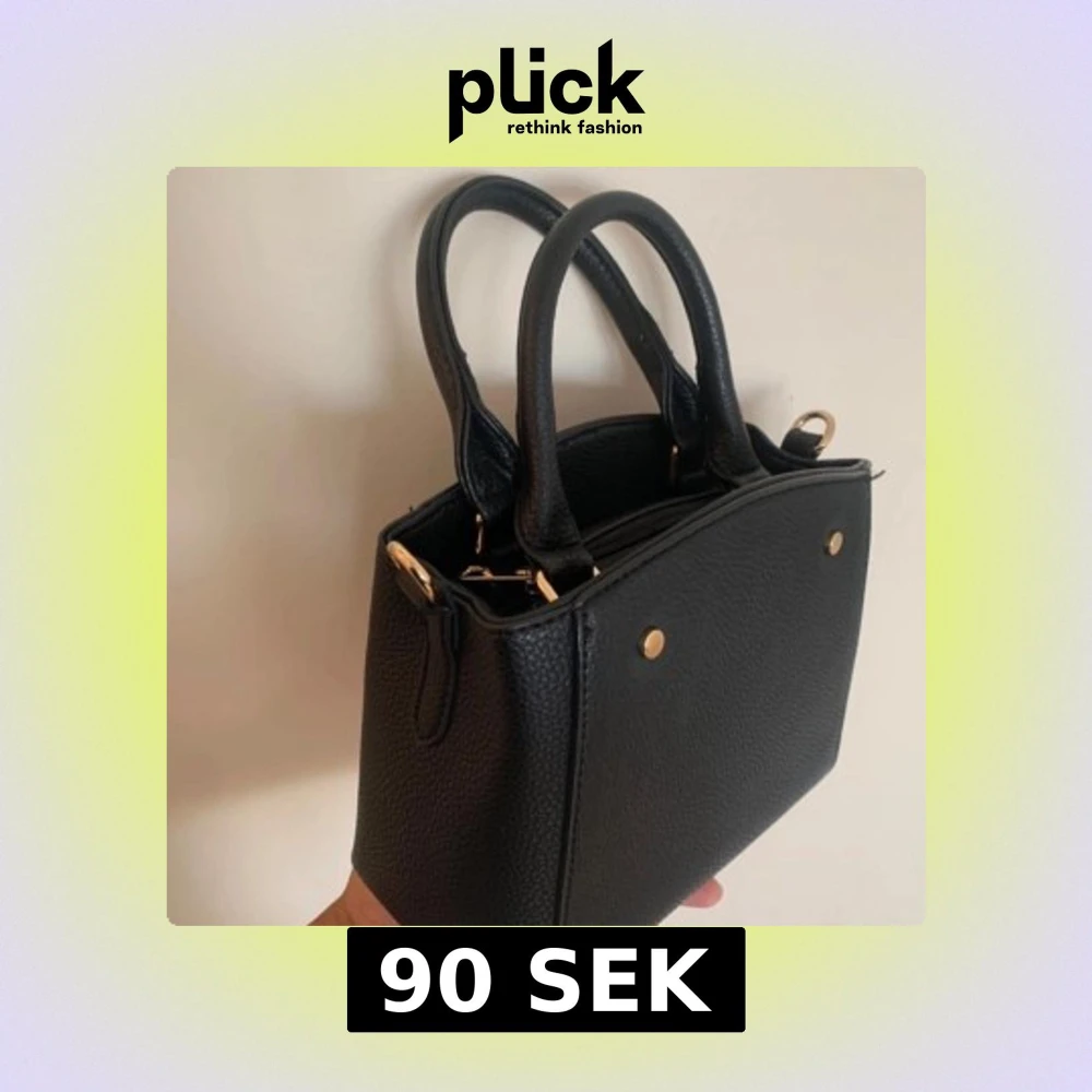 LITEN svart handväska i stilren boxig modell med två handtag och guldfärgade metalldetaljer. Väskan är gjord i strukturerat skinnimitation och har plats för det viktigaste. Perfekt att bära i handen eller med axelrem. Axelrem medföljer inte