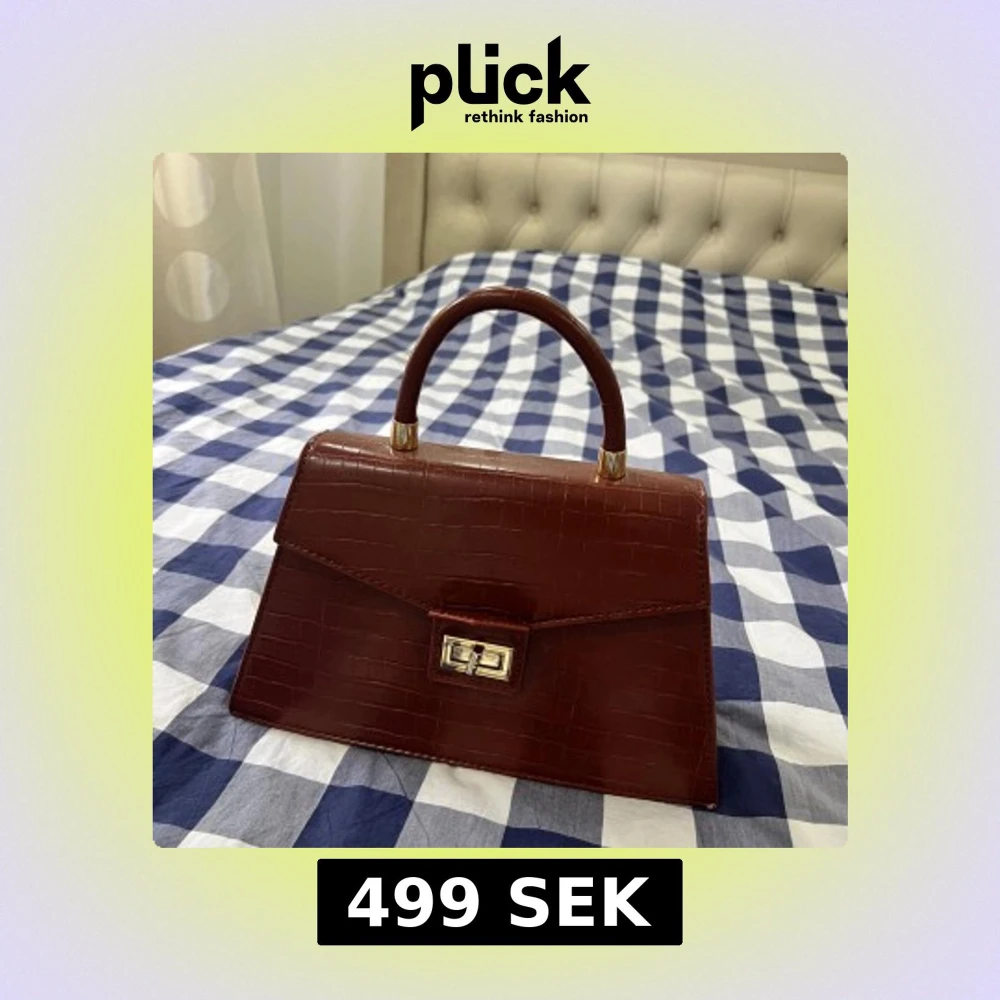 Säljer en snygg brun handväska med croco-mönster och guldfärgade detaljer. Väskan har ett stilrent handtag, vridlås framtill och dragkedja på baksidan. Perfekt accessoar för att lyfta din outfit.