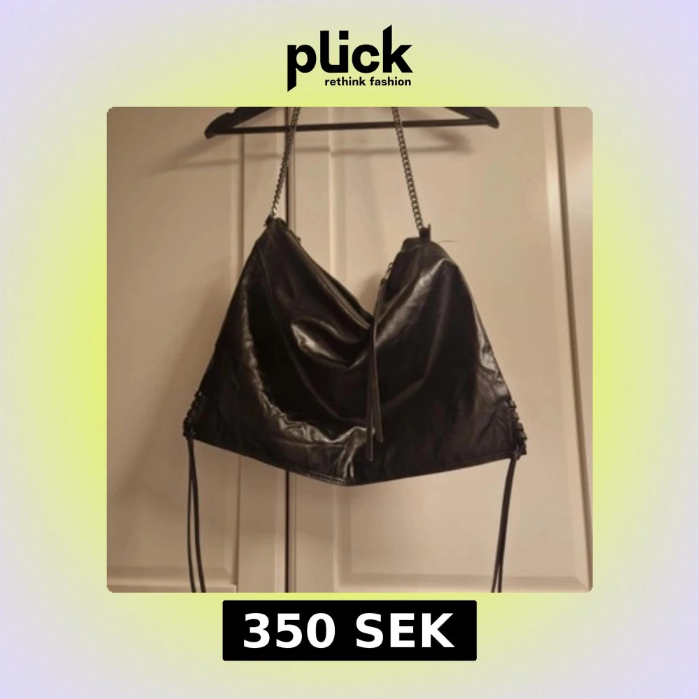 Cool svart axelvÀska i mjukt skinn med silverfÀrgad kedja som axelrem. VÀskan har en slouchy form, dragkedja upptill och lÄnga snören pÄ sidorna för extra edge. Perfekt storlek för allt du behöver och har en innerficka med dragkedja.