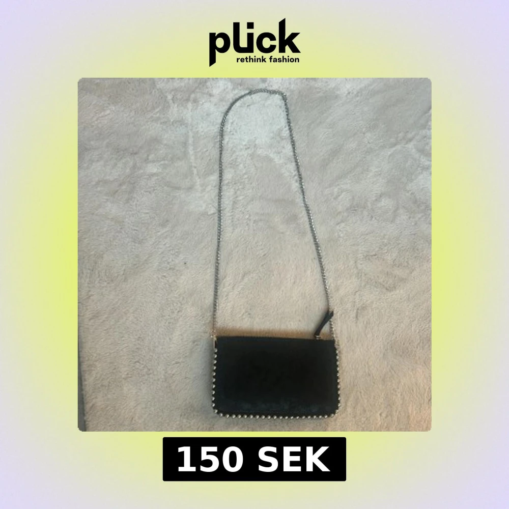 Snygg svart axelväska med glansig yta och silverfärgade nitar runt kanterna. Väskan har en lång kedjerem och dragkedja upptill. Perfekt storlek för mobilen och det viktigaste. Stilren och cool design som lyfter din outfit.