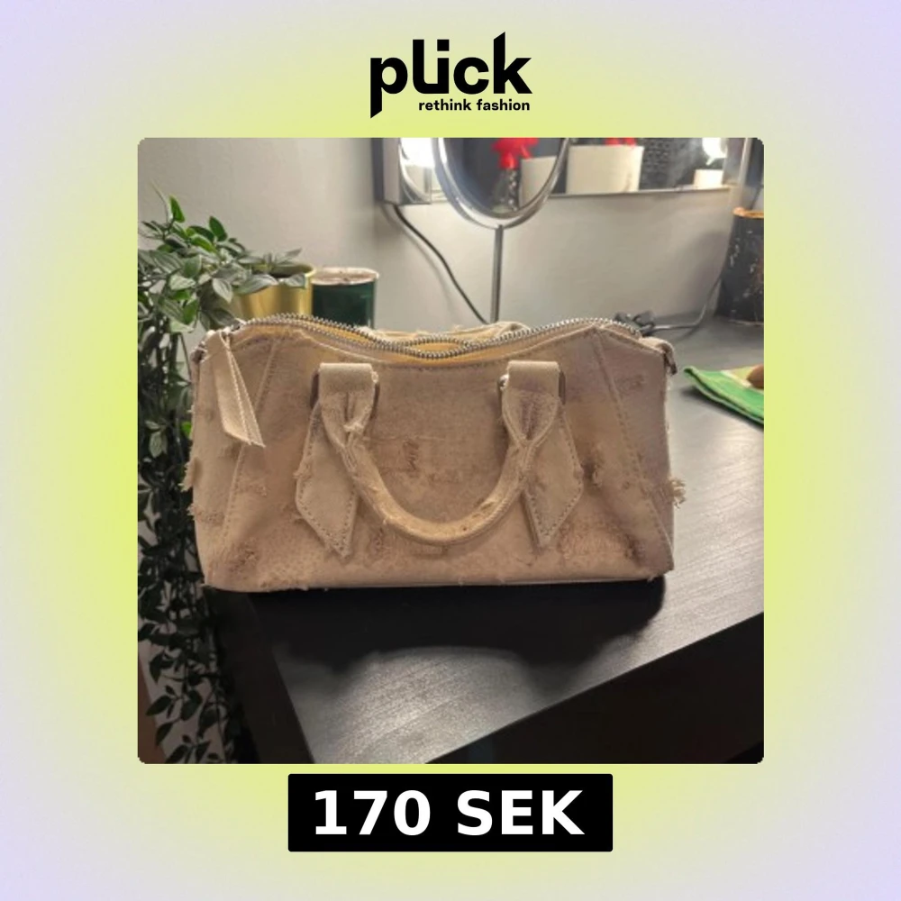 Säljer denna beigea axelväska i jeansmaterial med slitna detaljer och silverfärgad kedjerem. Väskan har både handtag och axelrem, samt dragkedja upptill. Den är endast använd några fåtal gånger och är därför i nyskick.