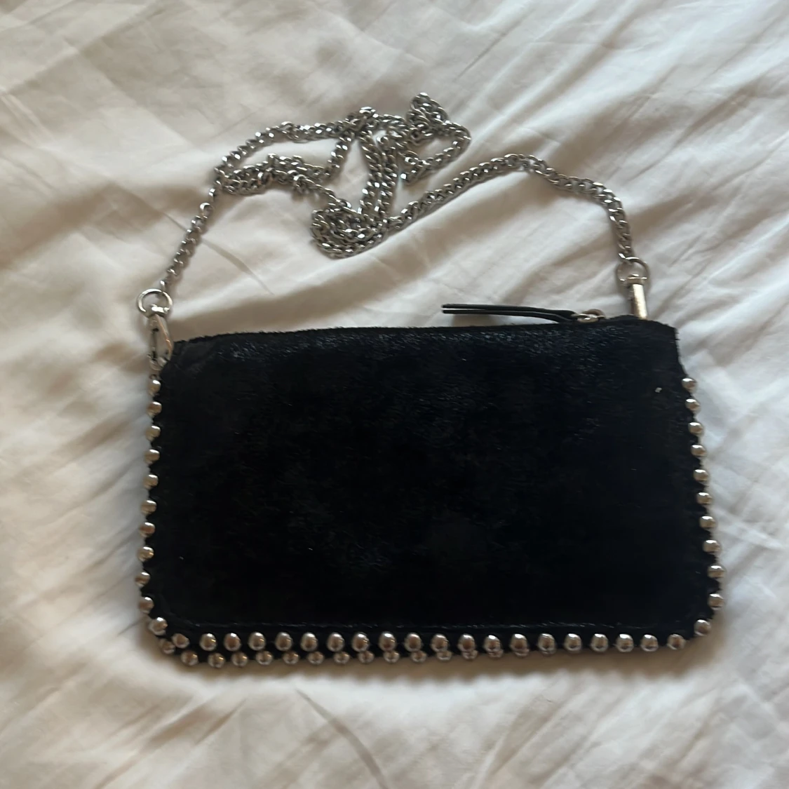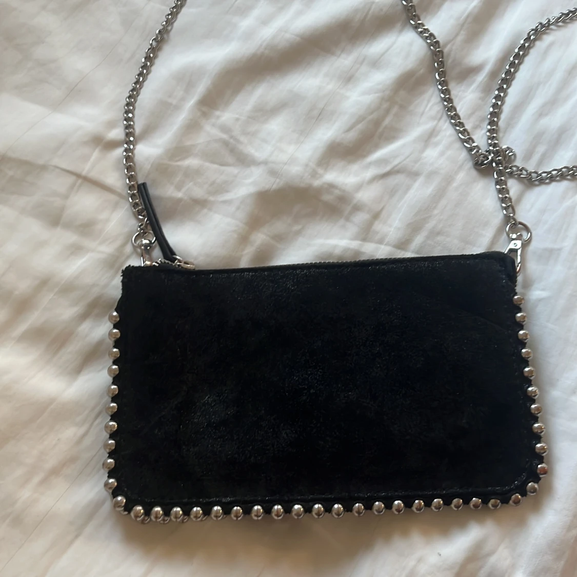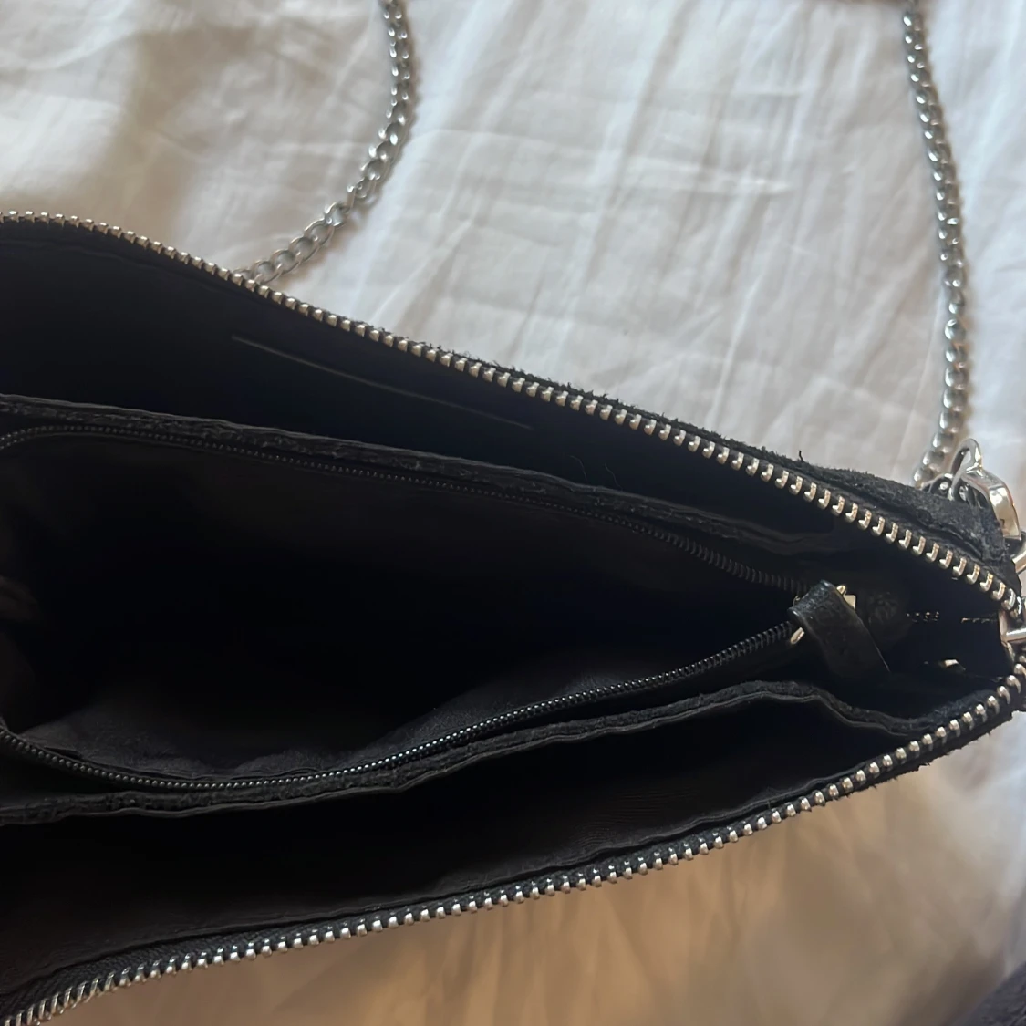 Snygg svart axelväska i mocka med silverfärgad kedja och coola nitar längs kanterna. Väskan har dragkedja upptill och flera fack inuti för smidig organisering. Perfekt för dig som gillar en edgy och stilren look.