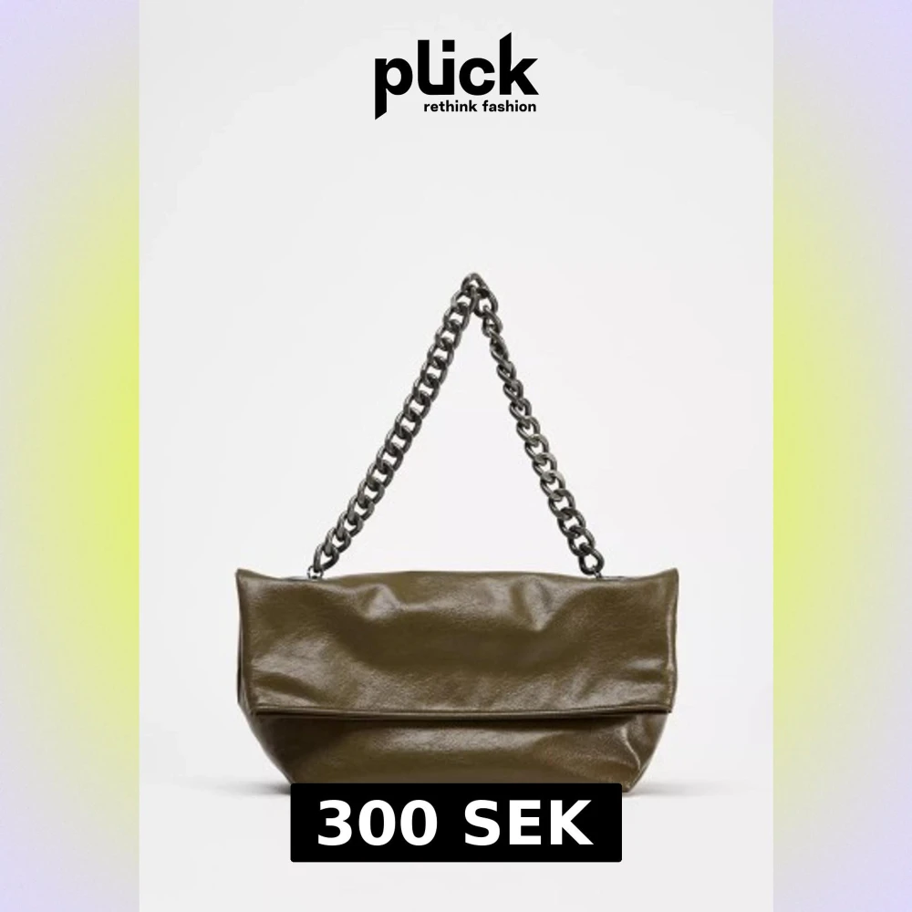 Snygg olivgrön axelväska i skinnimitation med en chunky metallkedja som axelrem