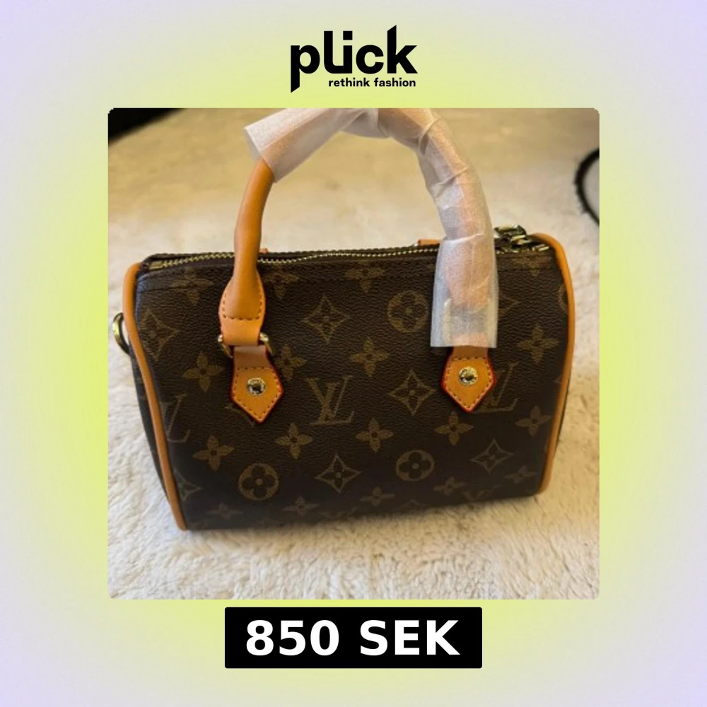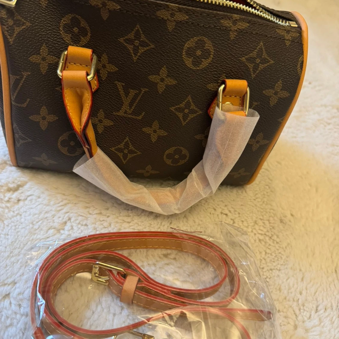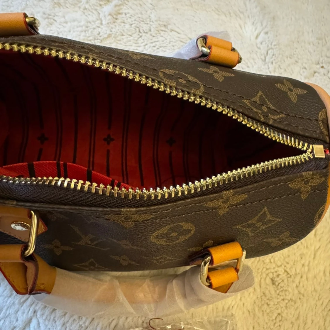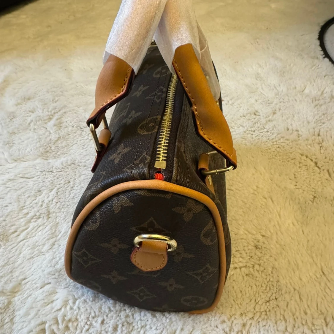 Snygg handväska med klassiskt monogrammönster i mörkbrunt och beige. Väskan har rundad form, ljusbruna handtag och detaljer i skinn samt guldfärgad dragkedja. Insidan är röd med svarta ränder. Avtagbar axelrem medföljer.