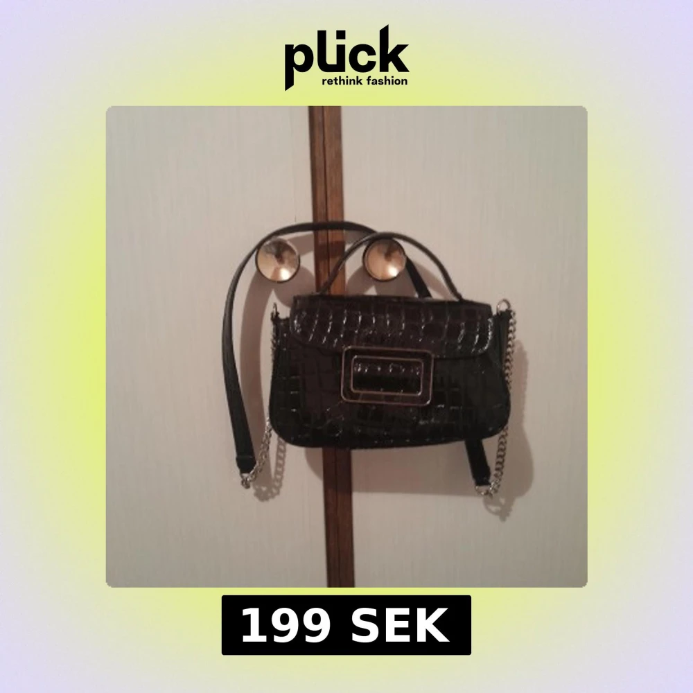 Snygg svart Zara axelväska med krokodilpräglat mönster och kedjedetaljer. Väskan har en dekorativ spänne på framsidan och ett praktiskt handtag. Perfekt för att ge din outfit en elegant touch.