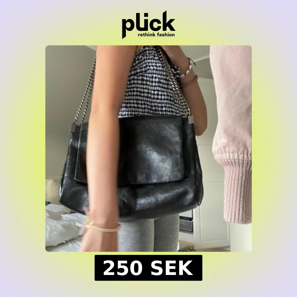 Stilren svart axelväska i skinnimitation köpt på Zara. Väskan har en enkel, fyrkantig form och passar perfekt till en trendig vardagslook. Rymmer allt du behöver och ger en edgy touch till outfiten. har börjat rosta pyttelite på ena kedjan, skriv för bilder.