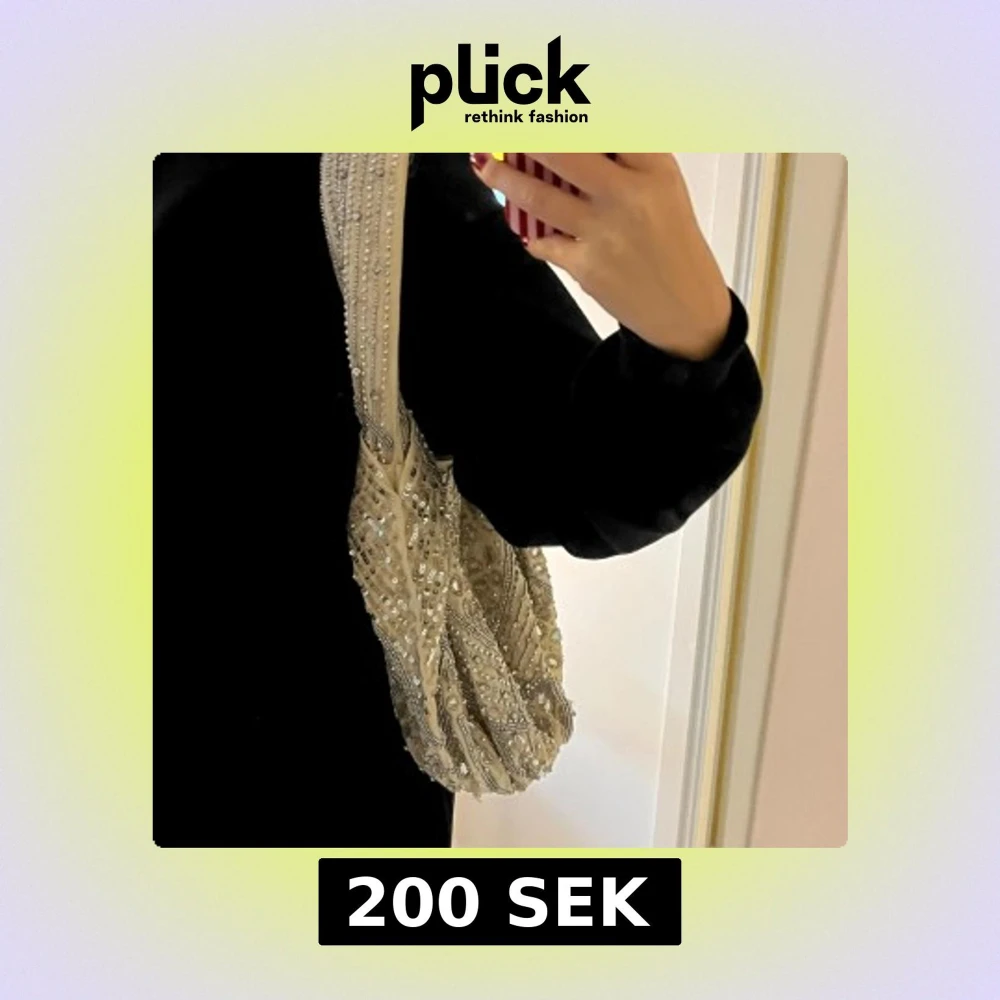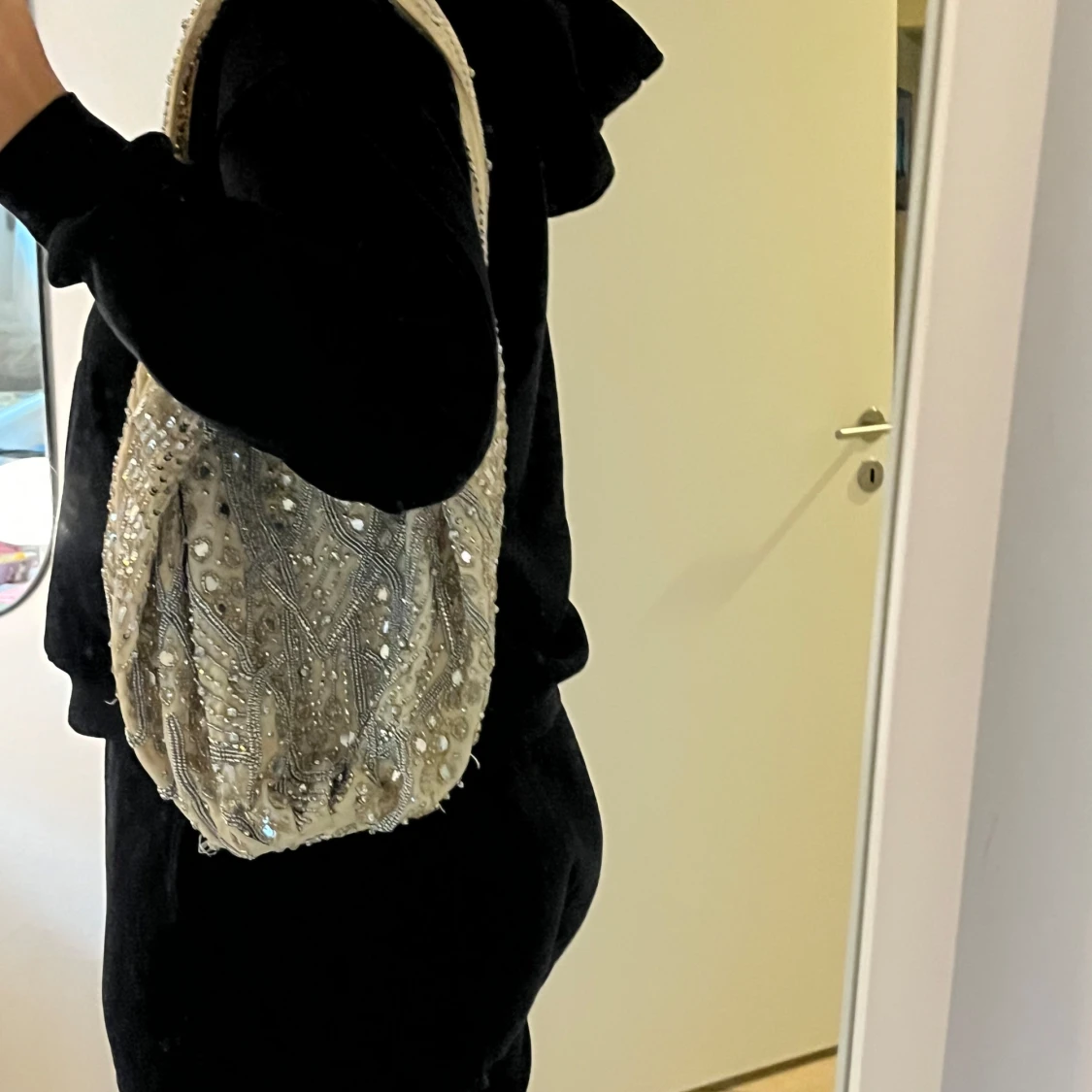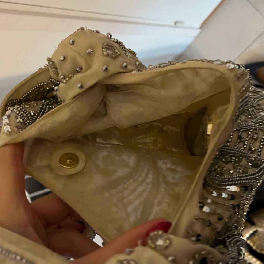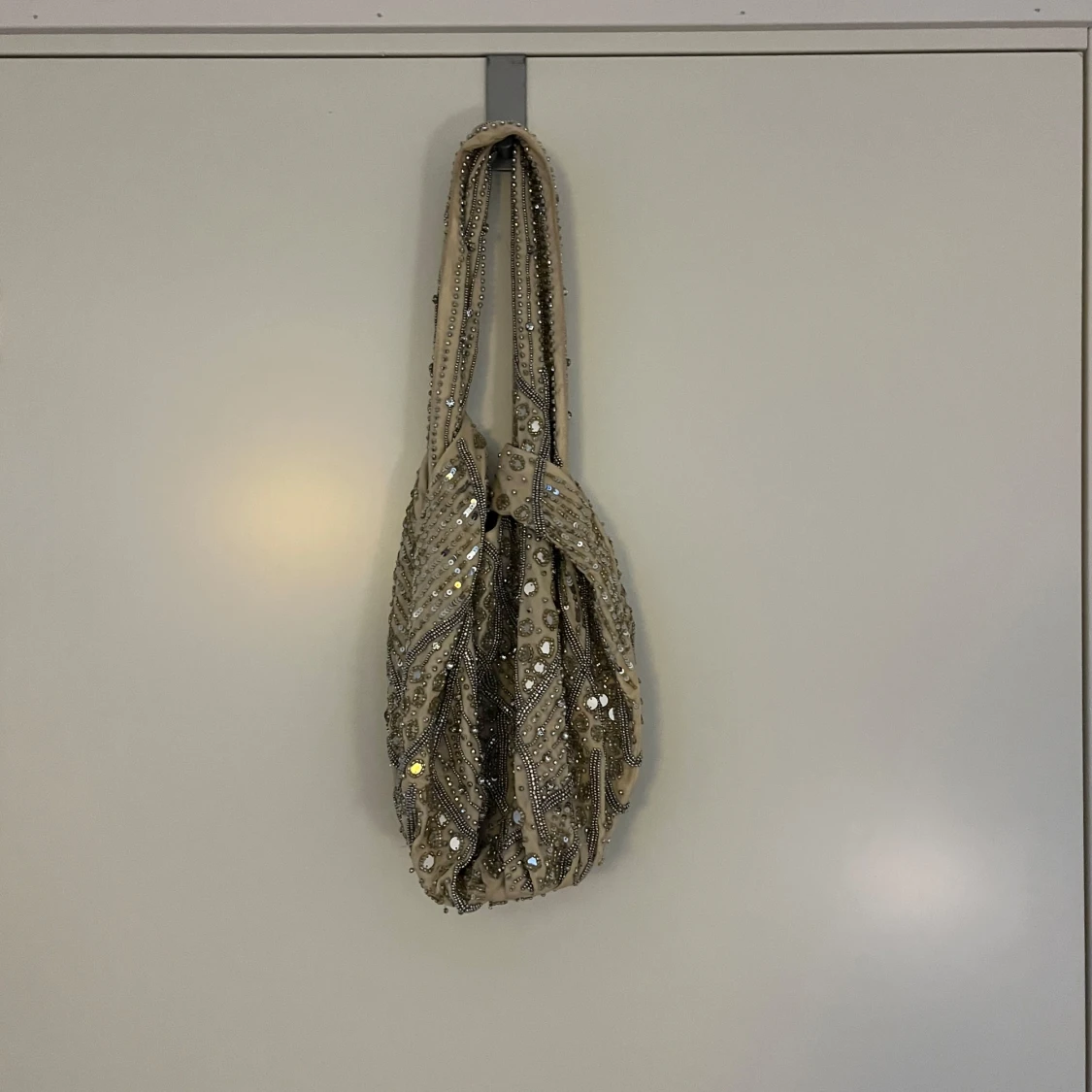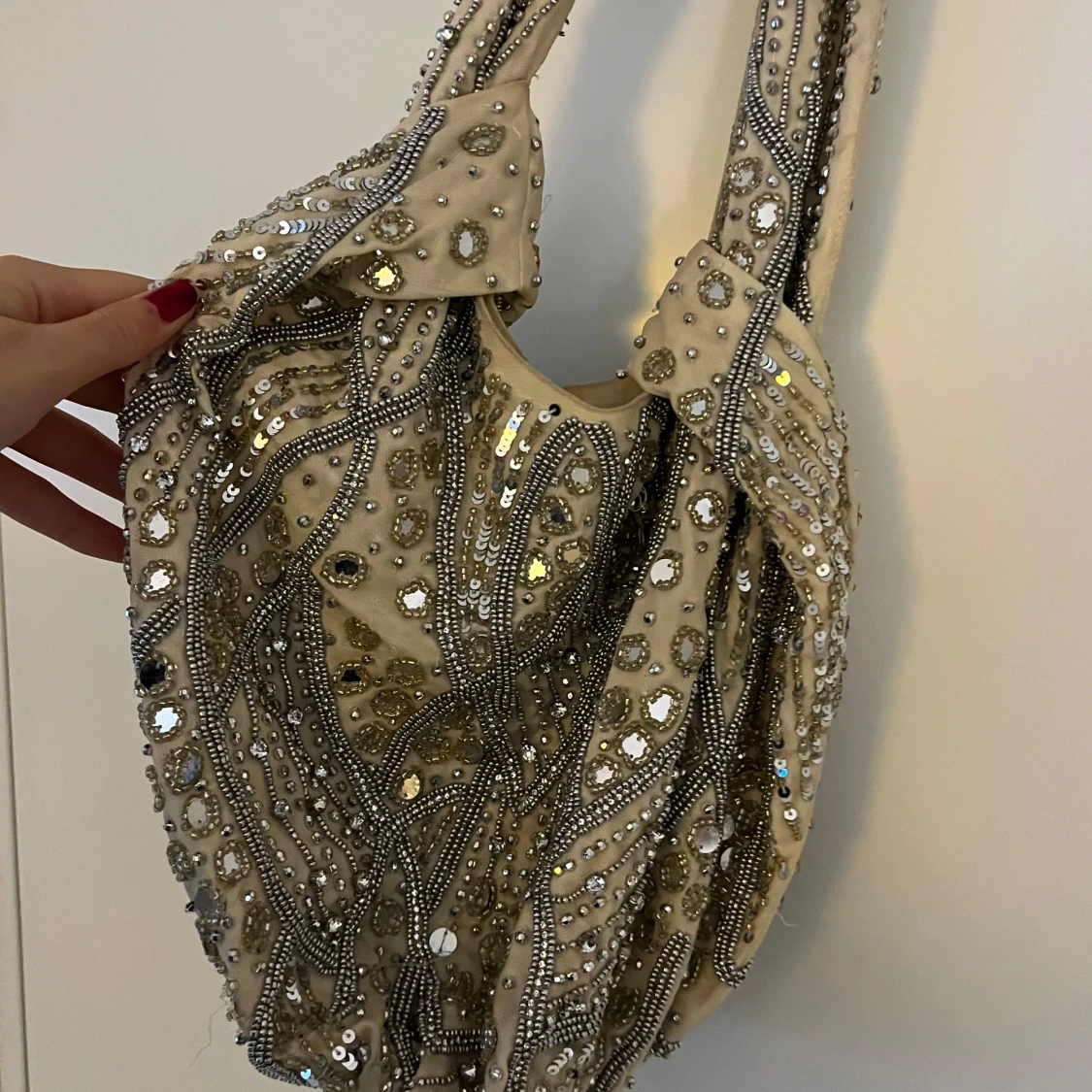 Superfin beige axelväska med massor av paljetter, pärlor och glittriga detaljer. Använd fåtal gånger, som ny.