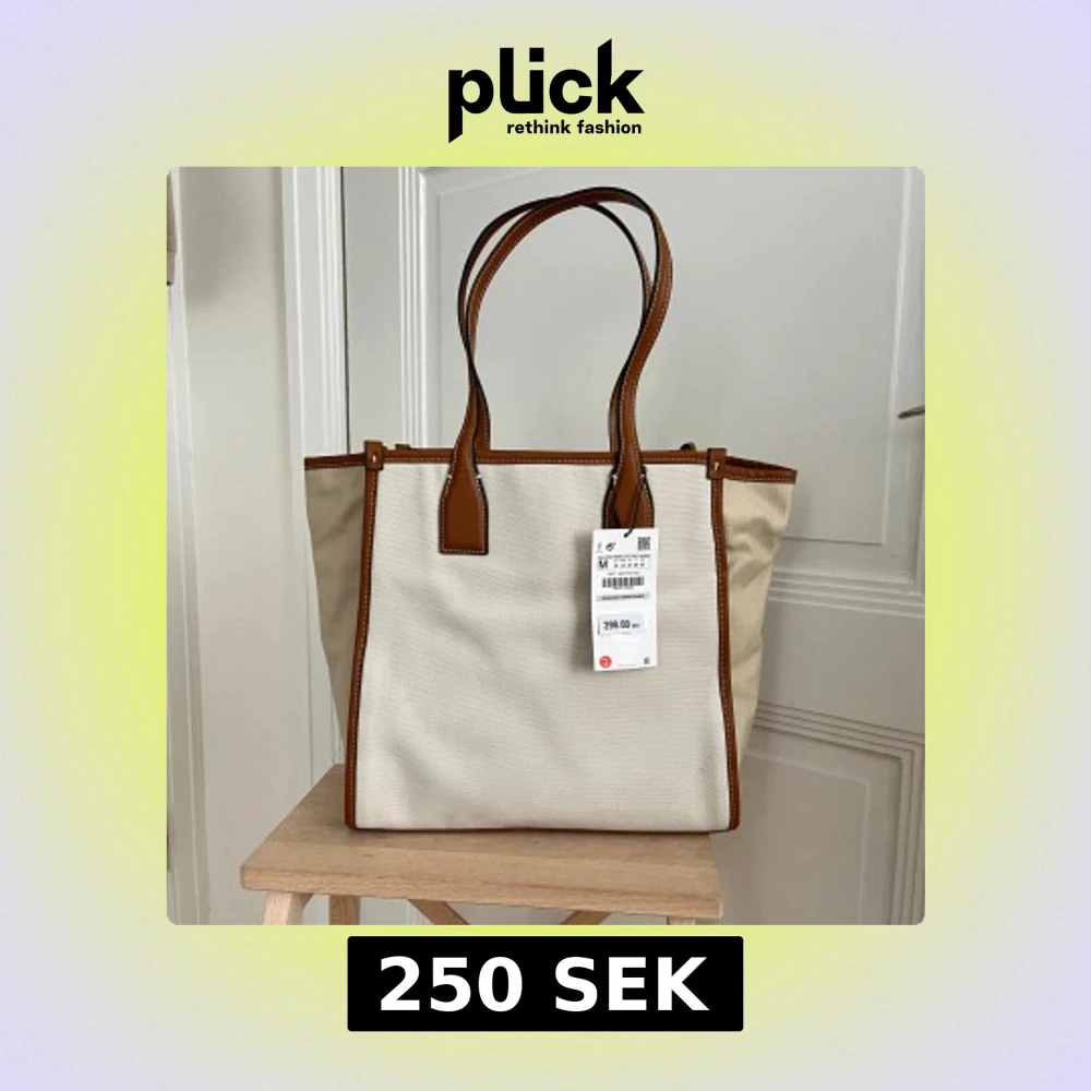 Stilren shoppingväska från Zara i beige bomullstyg med bruna skinnhandtag och detaljer. Väskan har rejäla handtag, rymligt fack och innerficka med dragkedja. Perfekt för att bära allt du behöver till skolan eller stan.