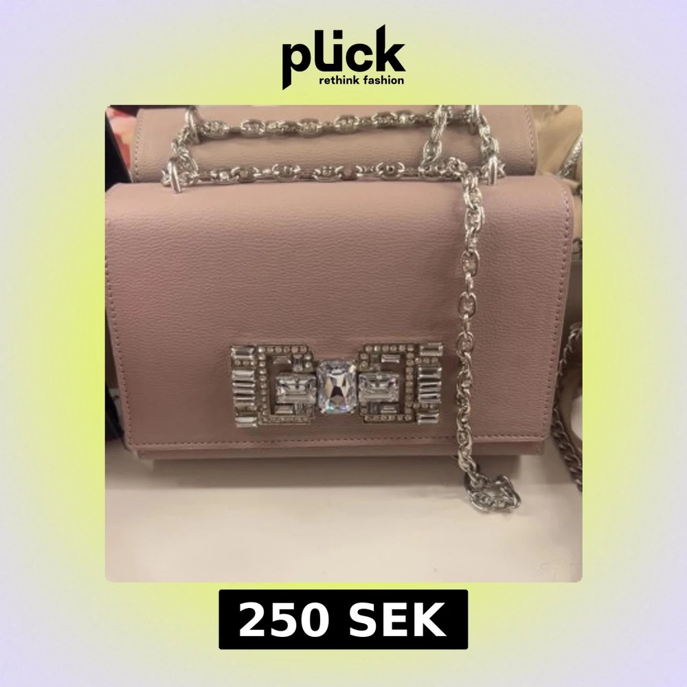 Säljer en stilren rosa axelväska med silverfärgad kedja och dekorativt spänne med stora strasstenar framtill. Väskan har en elegant och boxig form, perfekt för att lyfta din outfit. Använd en gång, inga defekter. Köptes för ca 500kr
