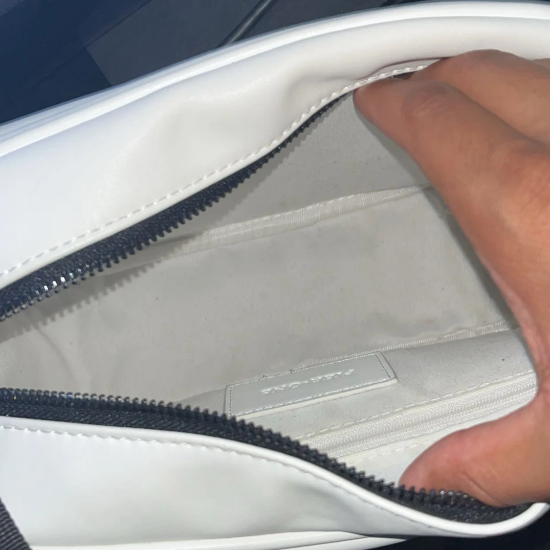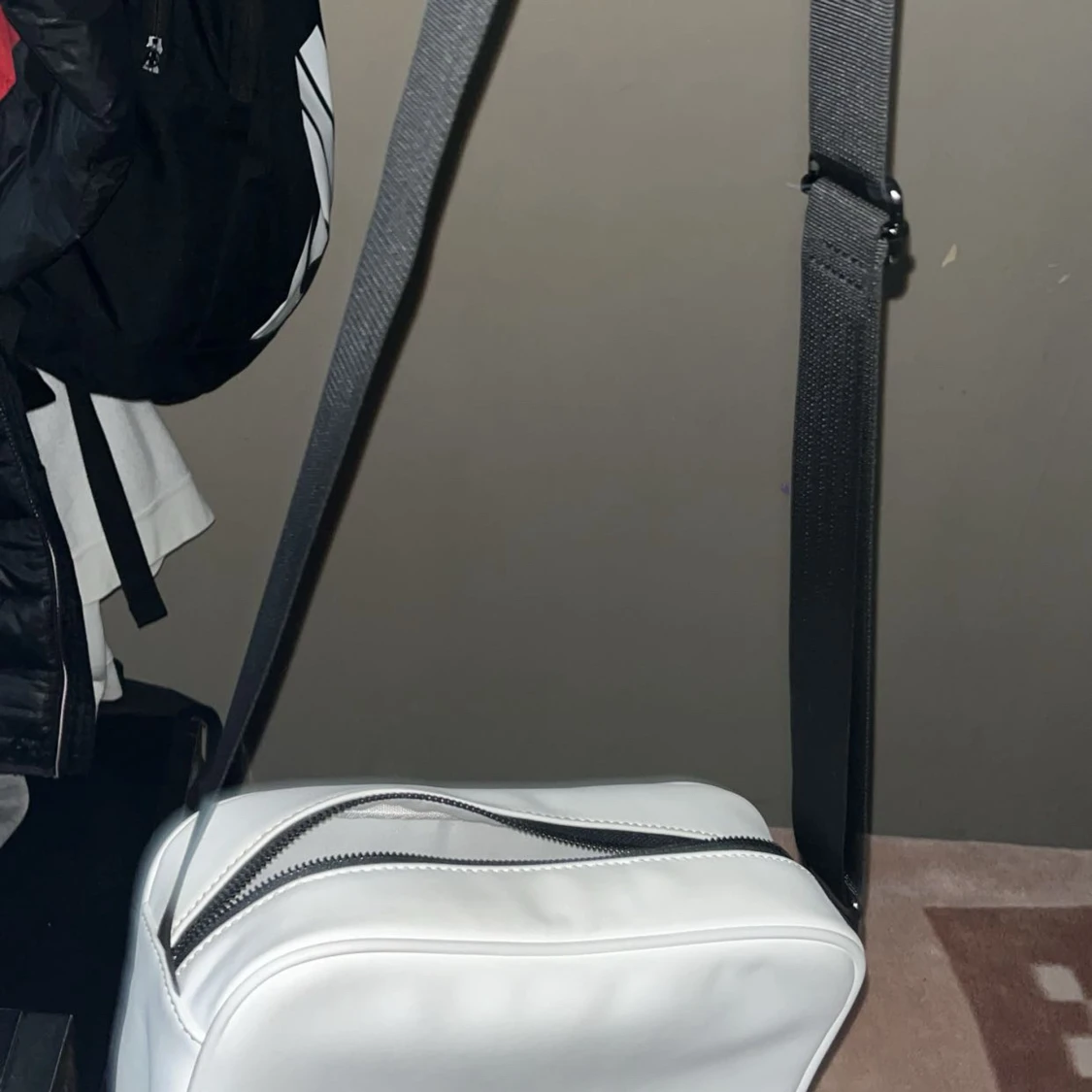 Snygg vit axelväska från Zara med två stora fack och svarta dragkedjor. Väskan har en justerbar axelrem i svart och är tillverkad i slätt syntetmaterial. Perfekt storlek för att få plats med allt du behöver och stilren design som passar till många outfits.