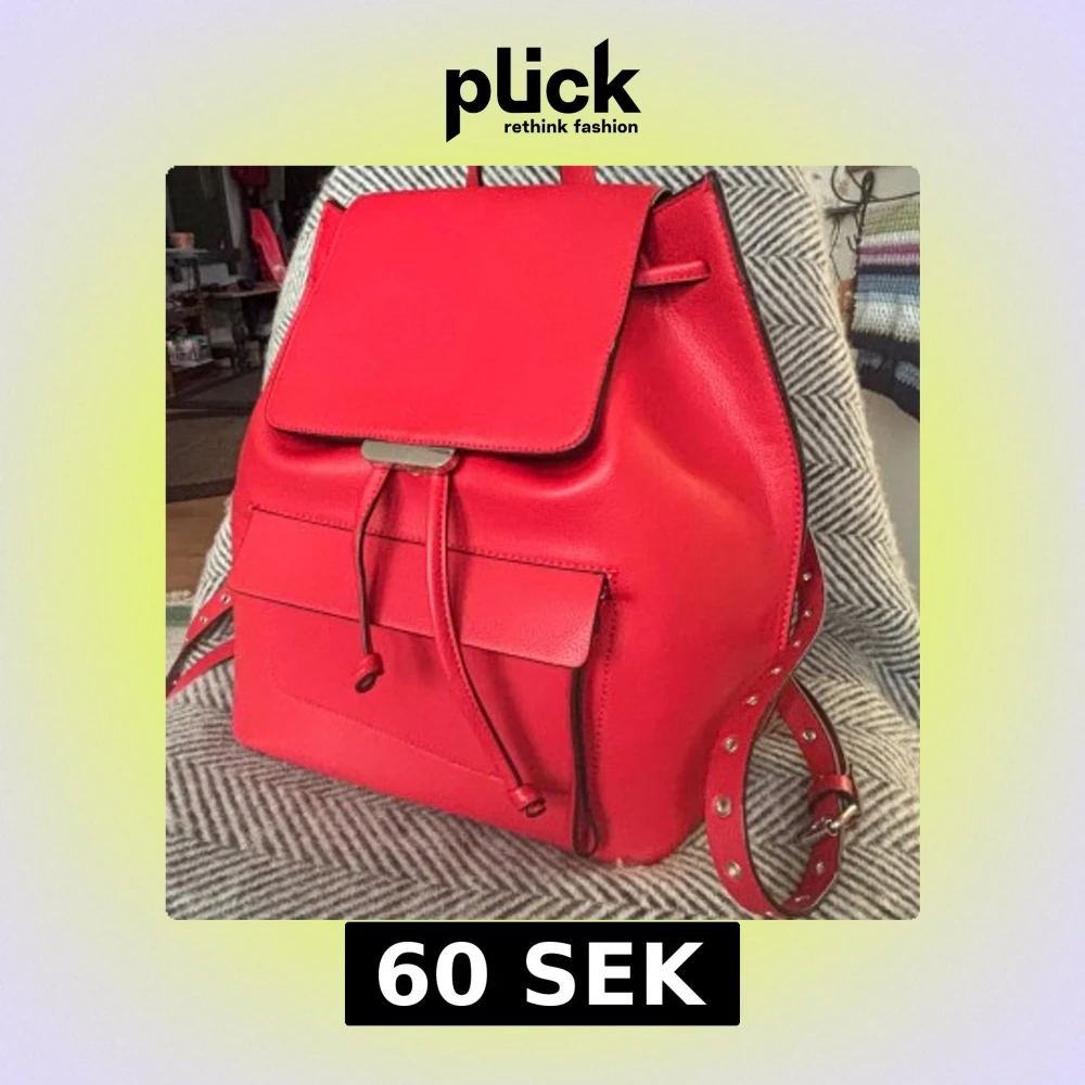 Snygg röd ryggsäck i skinnimitation från Zara med justerbara axelremmar med nitar, framficka och dragskostängning. Kommer tyvärr inte till användning för mig. Superbra skicka förutom en liten spricka under metallknappen (se bild)