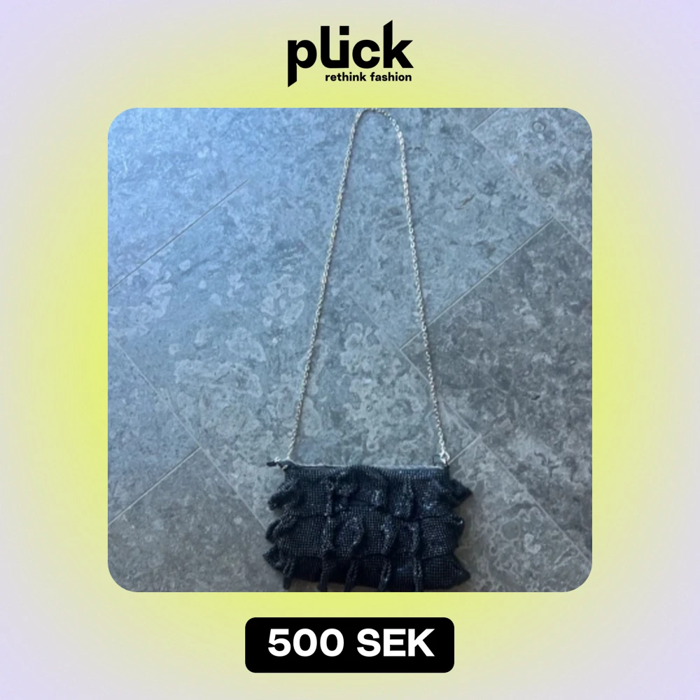 Säljer en superfin svart axelväska från Zara. Väskan är glittrig och har en cool design med volanger på framsidan. Den har en silverfärgad kedja som axelrem och stängs med dragkedja. Perfekt för fest eller en utekväll när du vill ha något extra!
