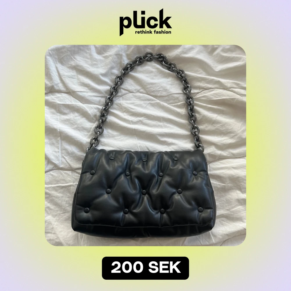 Säljer en snygg svart axelväska i quiltat skinn med en cool kedja som axelrem. Väskan har en stilren design med knappliknande detaljer och en praktisk dragkedja inuti. Perfekt för både vardag och fest! 🖤