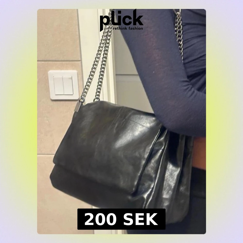 Snygg svart axelväska i skinn med grov silverfärgad kedja som axelrem. Väskan har en stilren, mjuk form och ett lock framtill. Perfekt storlek för att få plats med allt nödvändigt och ger en cool vibe till outfiten.