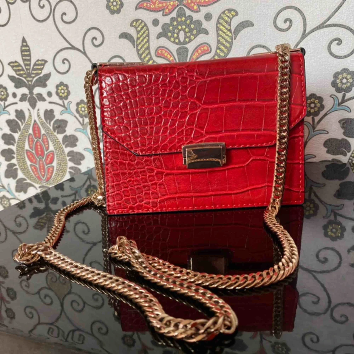 Oerhört fin röd väska, i fake ormskin, helt oanvänd och väldigt rymlig.
