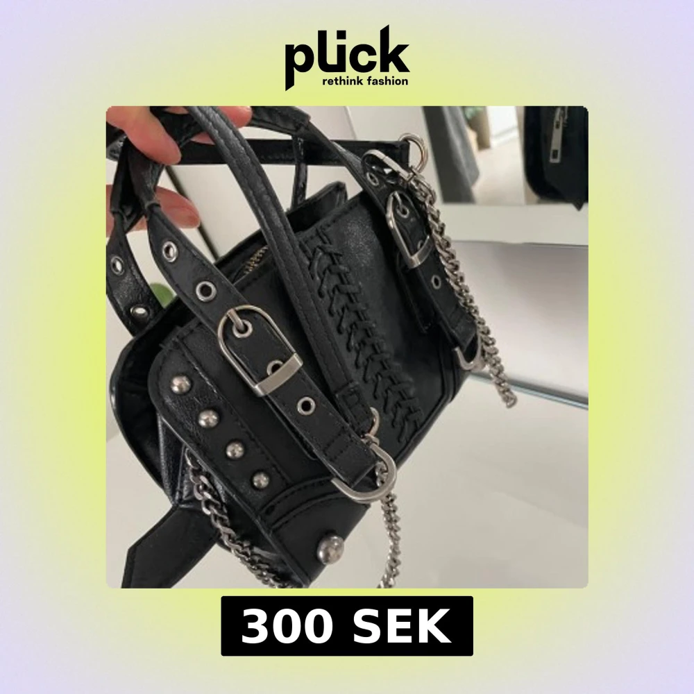 Cool svart handväska med silverfärgade kedjor, nitar och spännen. Lite mindre defekter på handtagen som ni kan se på bilden men inget mer än de🥰