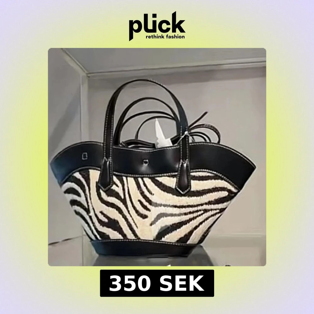 Cool handväska med svart-vitt zebramönster och svarta skinn-detaljer. Väskan har två handtag och en unik, bred form som sticker ut. Perfekt för dig som vill ha en statement-accessoar med trendig djurprint och snygga kontraster.