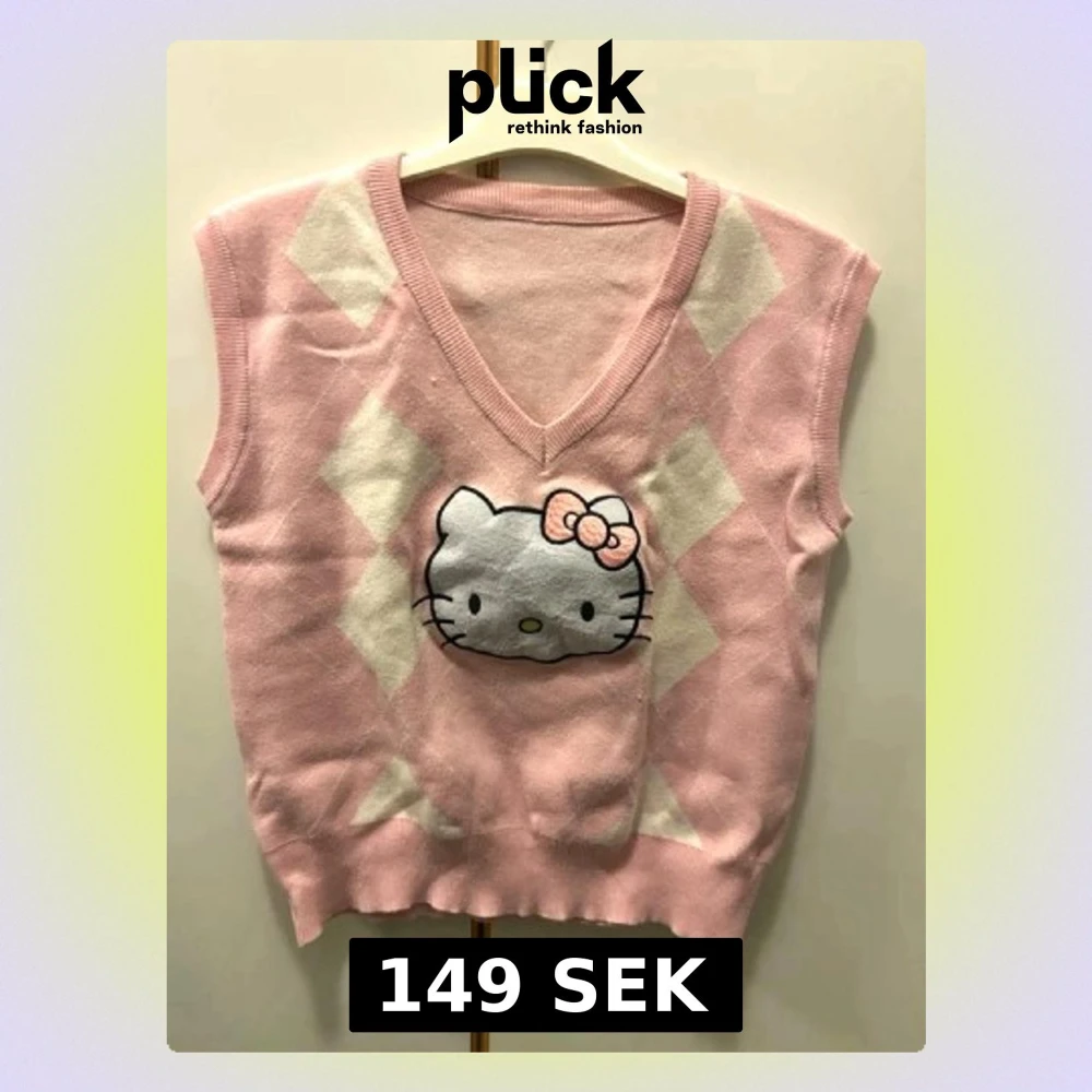 Söt rosa väst med v-ringning och Hello Kitty-motiv på framsidan. Västen har vita rutor i ett rutigt mönster och är gjord i mjukt stickat material.