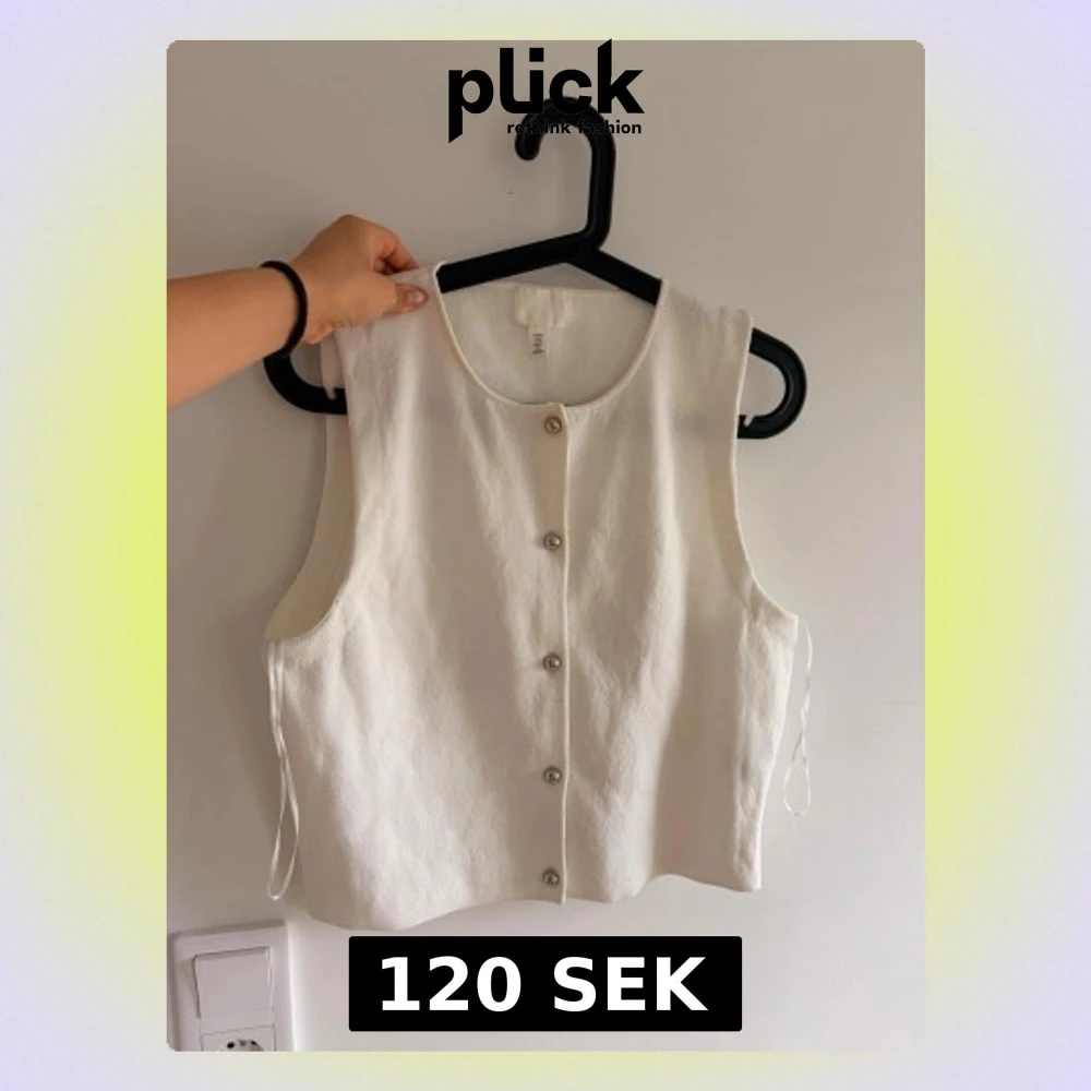 Stilren vit väst från H&M med rund halsringning och raka axlar. Västen har knäppning framtill med silverfärgade knappar och är tillverkad i ett mjukt tyg som känns bekvämt mot huden. Perfekt att styla över en skjorta eller t-shirt.