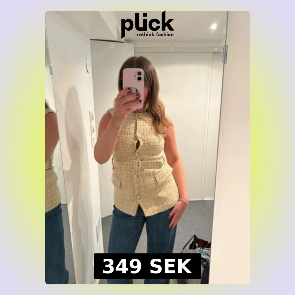 Stilren beige väst i strukturerat tyg med stora dekorativa knappar framtill och matchande bälte i midjan. Västen har två fickor och en lätt figurnära passform som ger en snygg siluett. Perfekt att styla över en t-shirt eller skjorta för en trendig look. Som tyvärr är för liten vid bysten.