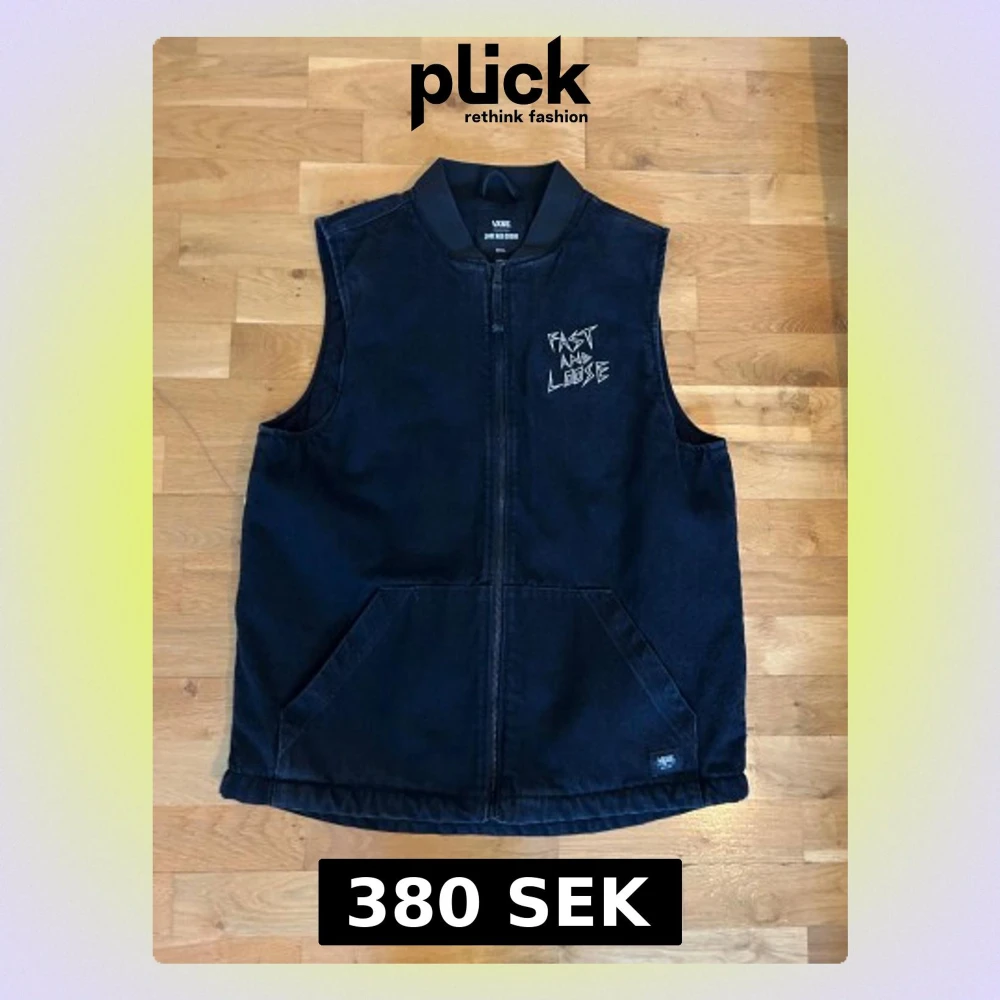 Svart väst från Vans med dragkedja framtill och två stora fickor. Framsidan har broderad text, baksidan har en patch. Materialet är slitstark bomull och polyester, utsidan liknar ett jeansmaterial. Jag har knappt använt västen, så inga defekter. Den är som ny. Nypris runt 1000 kr, mitt pris är 700. Men det går att diskutera!