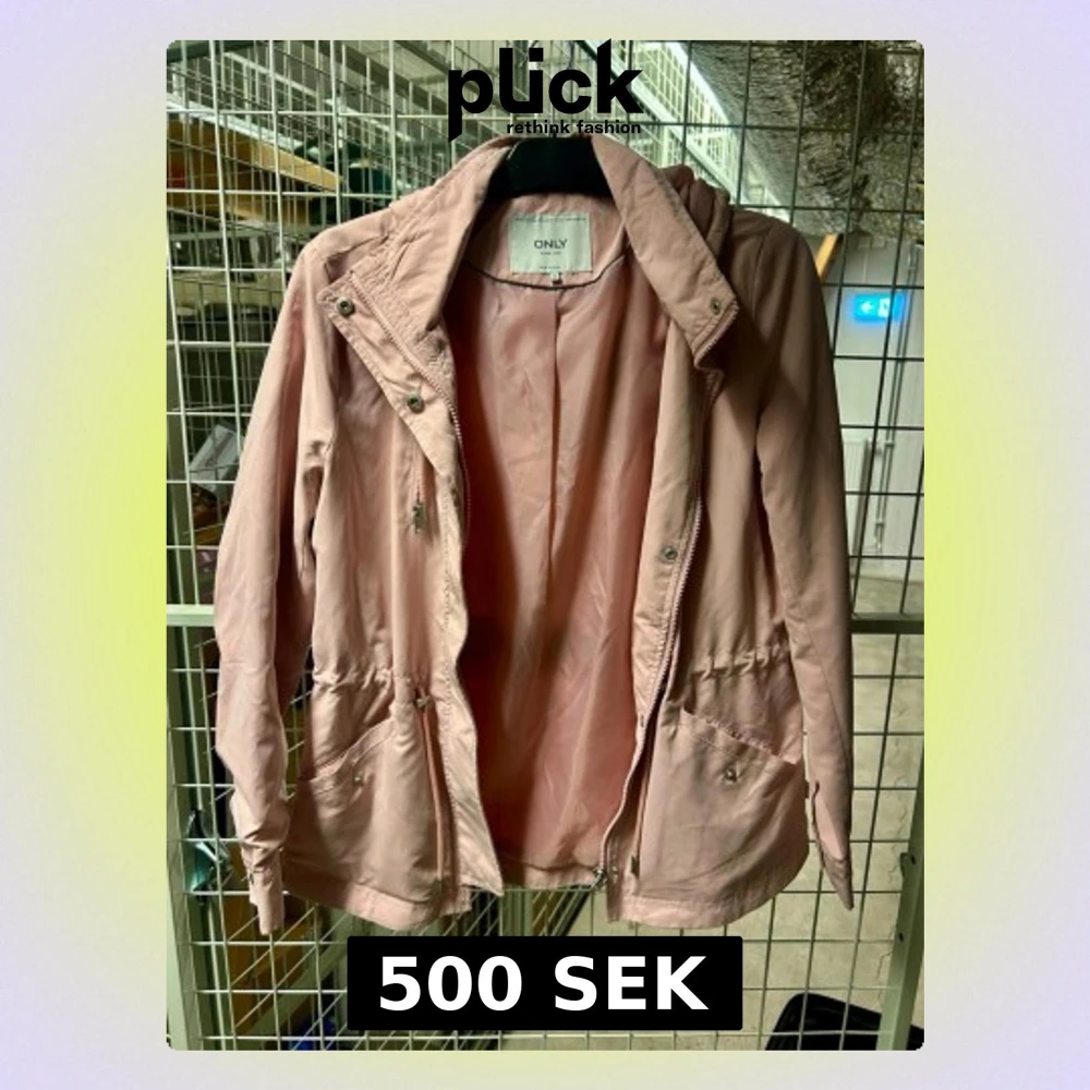 Snygg ljusrosa vindjacka från ONLY med dragkedja och tryckknappar framtill. Jackan har justerbar midja med snörning, två stora fickor med lock och knapp samt hög krage. Perfekt för blåsiga dagar och enkel att matcha till olika outfits.