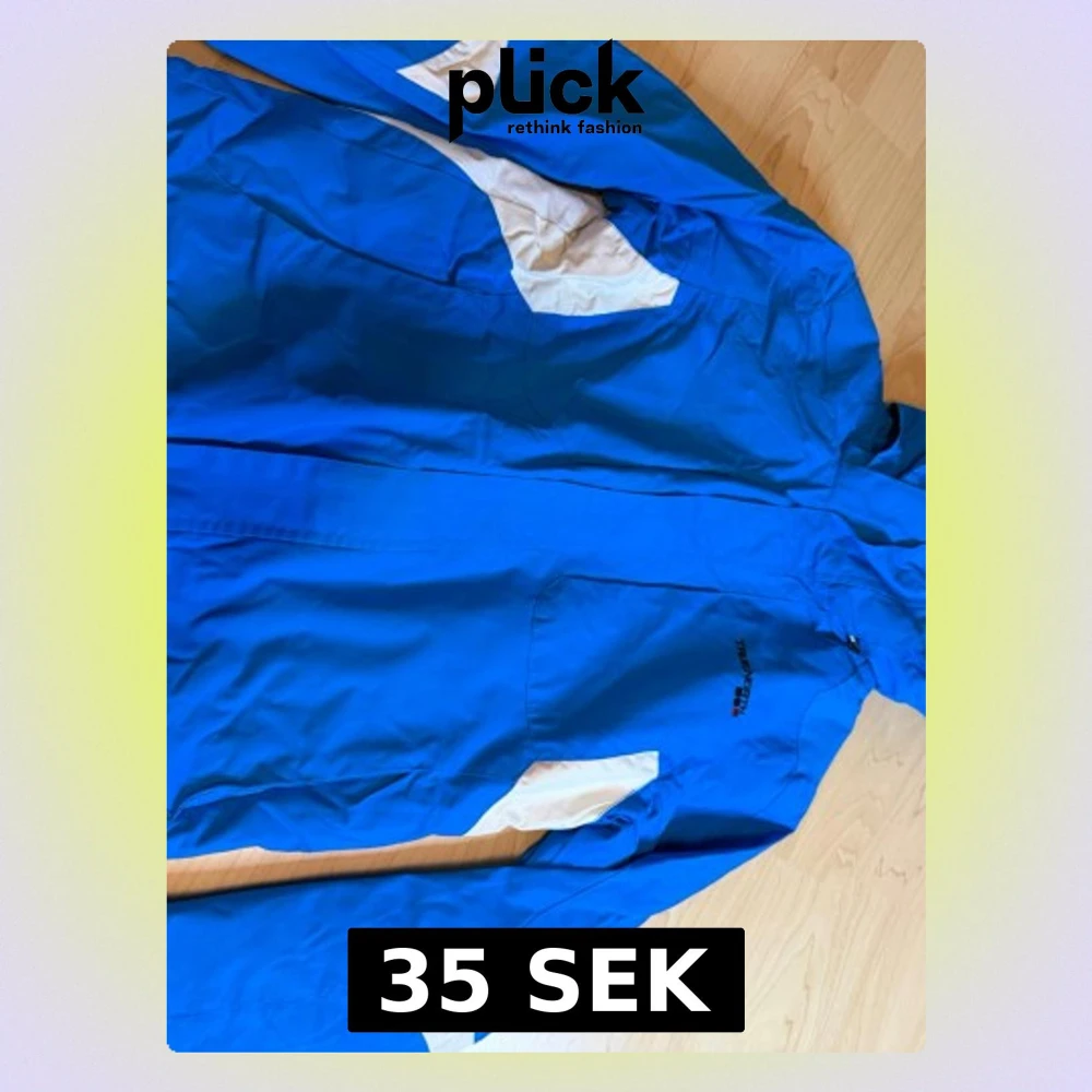 Säljer en blå vindjacka från True North med vita detaljer på ärmar och axlar. Jackan har dragkedja framtill och är tillverkad i ett lätt och tåligt material som skyddar mot vind. Perfekt för dig som vill ha en sportig och stilren look.