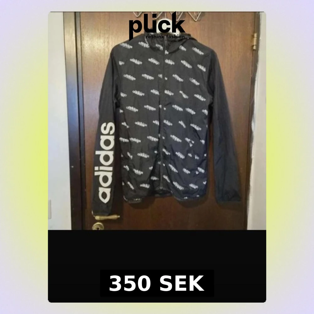Svart vindjacka från Adidas med hel dragkedja, huva och vit logotyptryck över hela jackan samt stort Adidas-tryck längs ena ärmen. Lätt material, perfekt för blåsiga dagar. Sportig och trendig look som sticker ut.