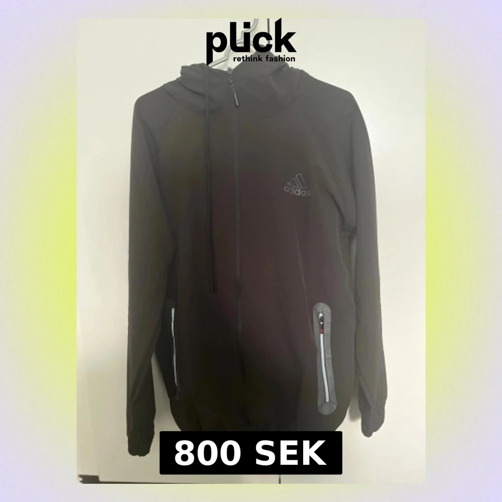 Snygg svart dress från Adidas med dragkedja framtill, huva med dragsko och två fickor med dragkedja. Jackan har Adidas-logga på bröstet och klassiska vita ränder på insidan. Tillverkad i lätt och vindtätt material, perfekt för blåsiga dagar.(byxor & tröja)
