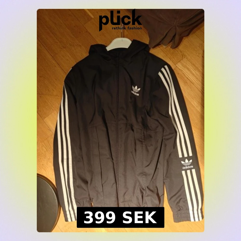 Snygg svart vindjacka från Adidas med klassiska vita ränder längs ärmarna och Adidas Trefoil-logga på bröstet. Jackan har dragkedja framtill, två sidofickor och huva. Tillverkad i lätt och tåligt material, perfekt för en sportig och avslappnad stil.