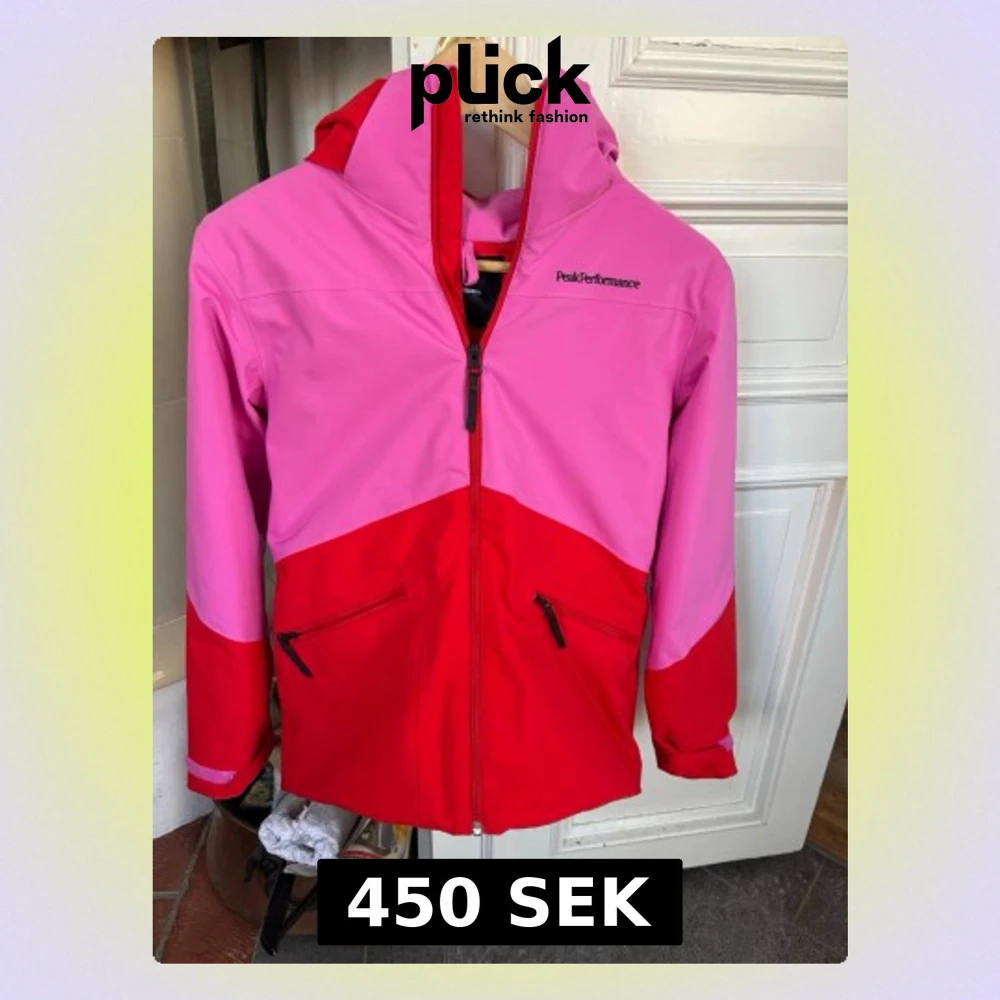 Snygg jacka från Peak Performance i tvåfärgad design med rosa upptill och röd nedtill. Jackan har huva, hel dragkedja framtill och två snedställda fickor med dragkedja. Materialet är lätt och vindtätt, perfekt för blåsiga dagar.