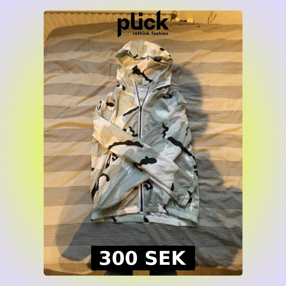 Snygg vindjacka i vitt med svart och grått camomönster. Jackan har dragkedja framtill och två fickor med dragkedja. Pris ej hugget i sten