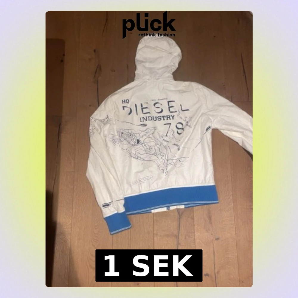 INTRESSE KOLLSnygg vit vindjacka från Diesel med blå muddar och dragkedja. Jackan har tryck med kartmotiv och texten 'Diesel Industry 78' på ryggen. Utrustad med huva och två fickor framtill. Perfekt för dig som vill sticka ut med en unik och sportig look.