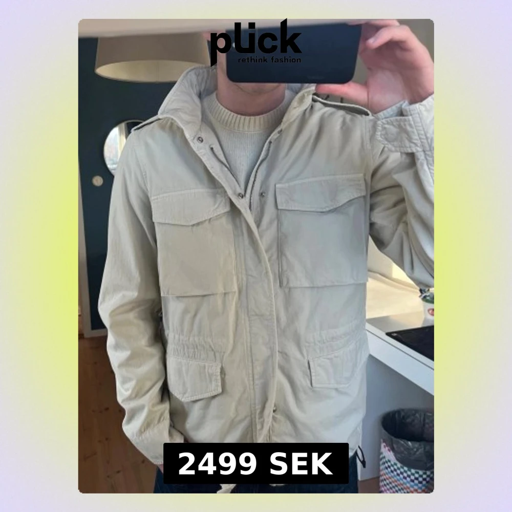 Helt oanvänd 10/10 skick. Stilren beige fieldjacka från Aspesi med fyra stora fickor framtill och hög krage med kardborrestängning. Jackan har dragsko i nederkant och axelklaffar. Tillverkad i lätt material som passar perfekt till vår och höst. Pris kan diskuteras.