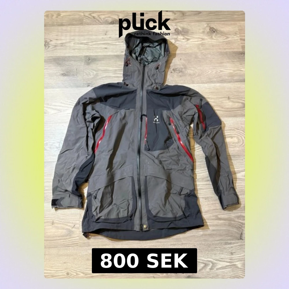 Snygg grå vindjacka från Haglöfs med svarta partier och röda dragkedjor. Jackan har flera fickor med dragkedja, justerbar huva och detaljer som ger en sportig look. Perfekt för utomhusaktiviteter och streetwear. Materialet är slitstarkt och vattenavvisande.