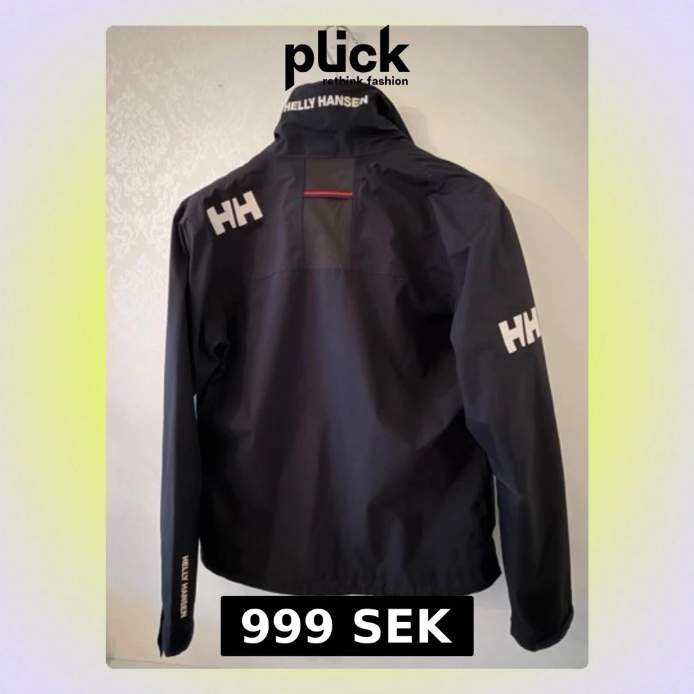 Snygg svart vindjacka från Helly Hansen med vita HH-loggor på ärm och axel samt röda detaljer på dragkedjorna. Perfekt för blåsiga dagar och sportig stil. Använd få tal gånger. Topp skick