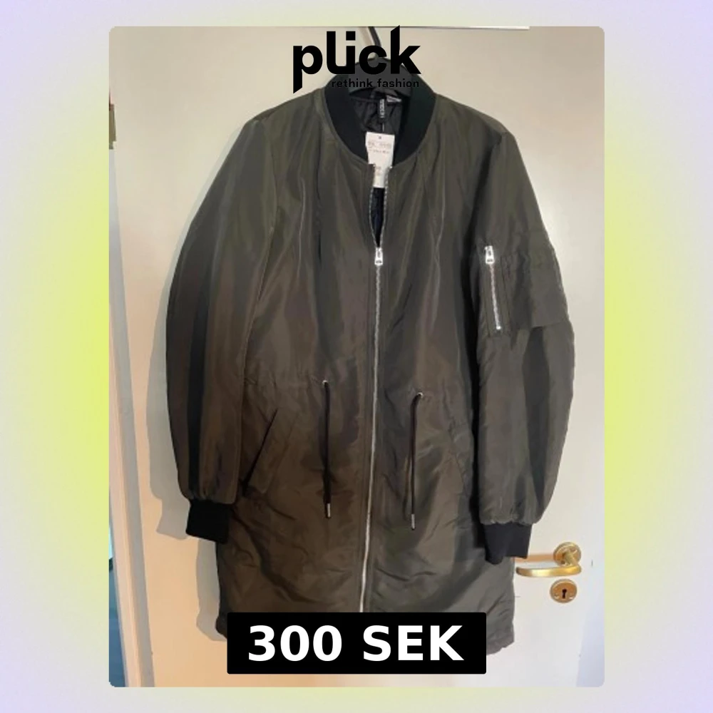 Stilren lång vindjacka i mörkgrönt från H&M. Jackan har dragkedja framtill, svarta muddar vid ärmslut och hals, samt snörning i midjan. Praktiska fickor och en ärmficka med dragkedja. Perfekt för blåsiga dagar och enkel att matcha.