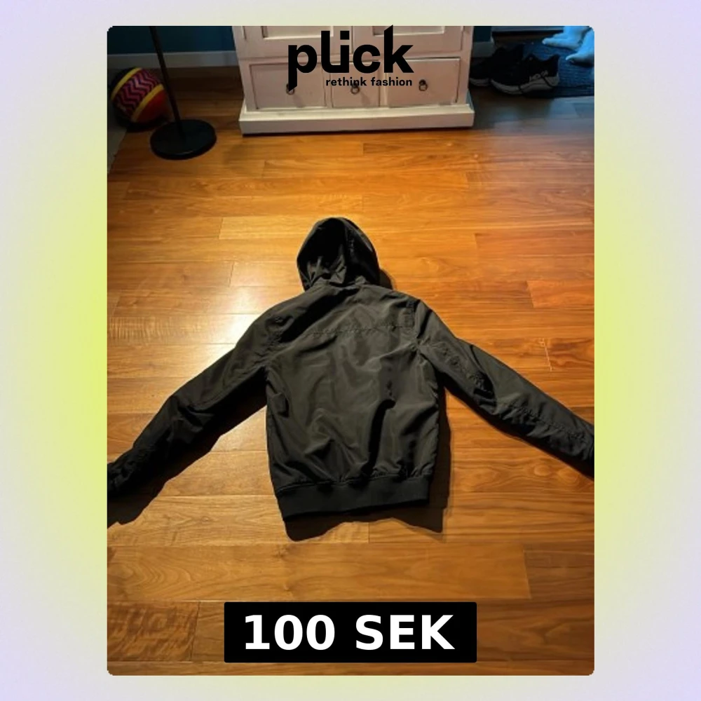 Säljer en svart vindjacka med huva och dragkedja framtill. Jackan har två snedställda fickor och ribbade muddar vid ärmslut och nederkant. Perfekt för blåsiga dagar och enkel att matcha med olika outfits.