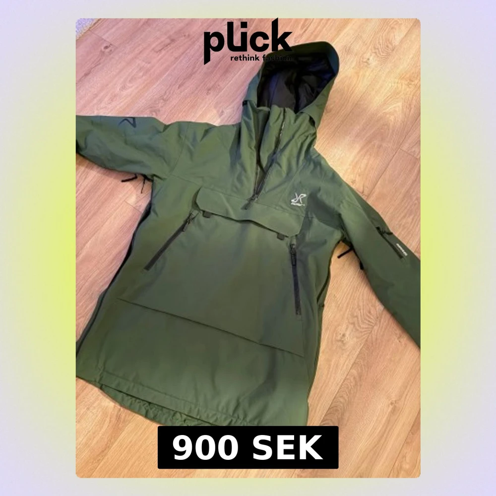 Säljer en grön skidjacka från RevolutionRace med huva och flera dragkedjeförsedda fickor. Jackan har en stor bröstficka, justerbar huva och är tillverkad i slitstarkt syntetmaterial.
