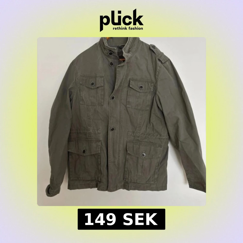 Snygg grön vindjacka med fyra stora fickor framtill och axelklaffar. Jackan har hög krage, knappar och dragkedja framtill. Perfekt för dig som vill ha en stilren och praktisk jacka till vardags. Längd: 69cm, P2P: 52cm