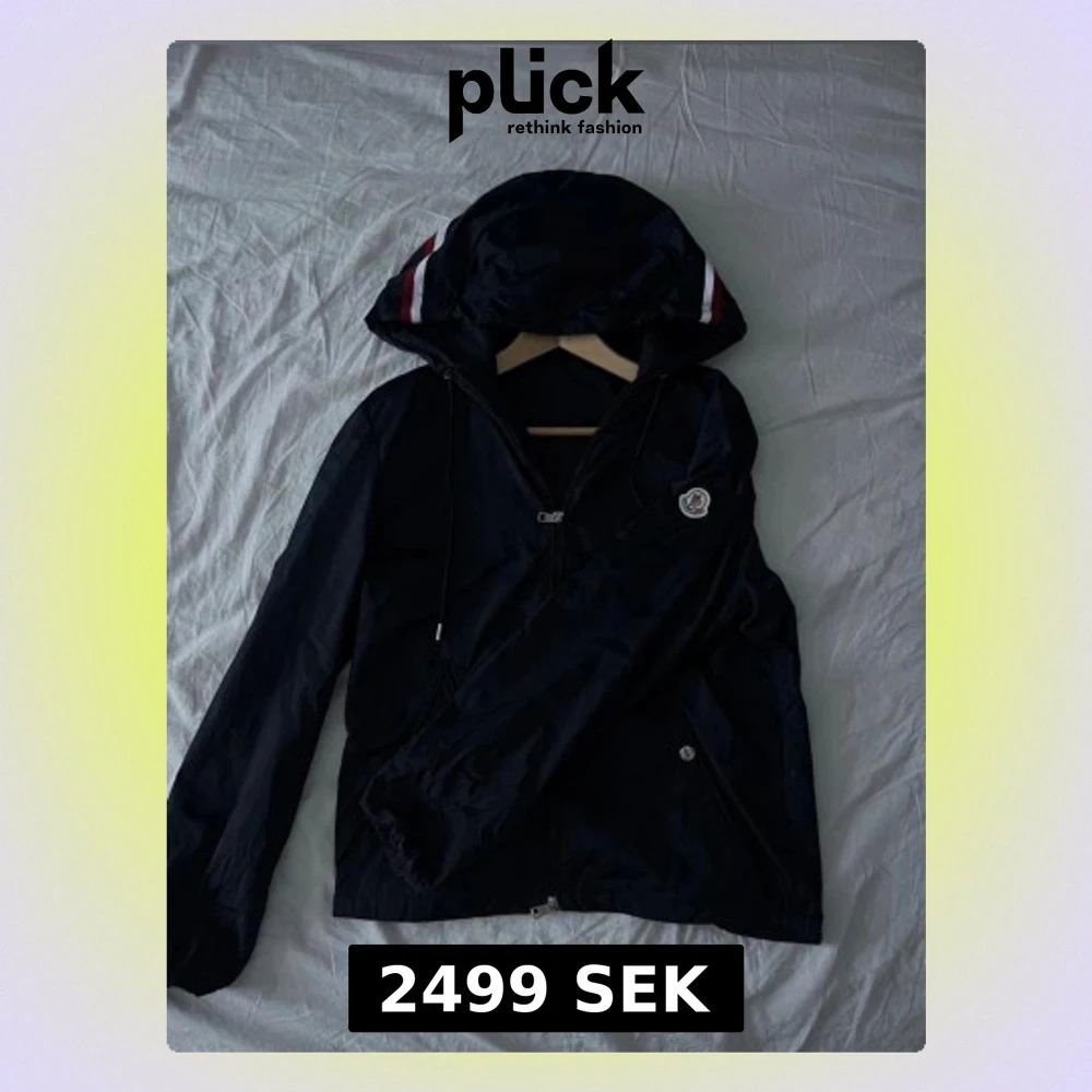 Säljer en svart vindjacka från Moncler med huva och vita/röda detaljer på huvan. Jackan har dragkedja framtill, två fickor med knappar och Moncler-logga på ärmen. Perfekt för blåsiga dagar och snygg att matcha med jeans. Pris kan bli diskuterat