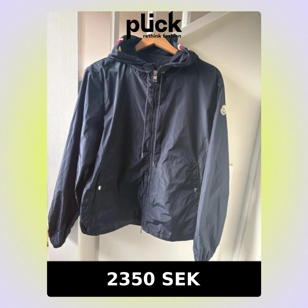 Snygg mörkblå vindjacka från Moncler med huva och dragkedja framtill. Jackan har två fickor med tryckknappar och Moncler-logga på ärmen. Materialet är tunt och lätt, perfekt för blåsiga dagar. Detaljer i rött, vitt och blått på huvan ger en sportig touch. Säljer den pågrund av att den har blivit för liten för mig. Endast använd fåtal gånger på 2 år.