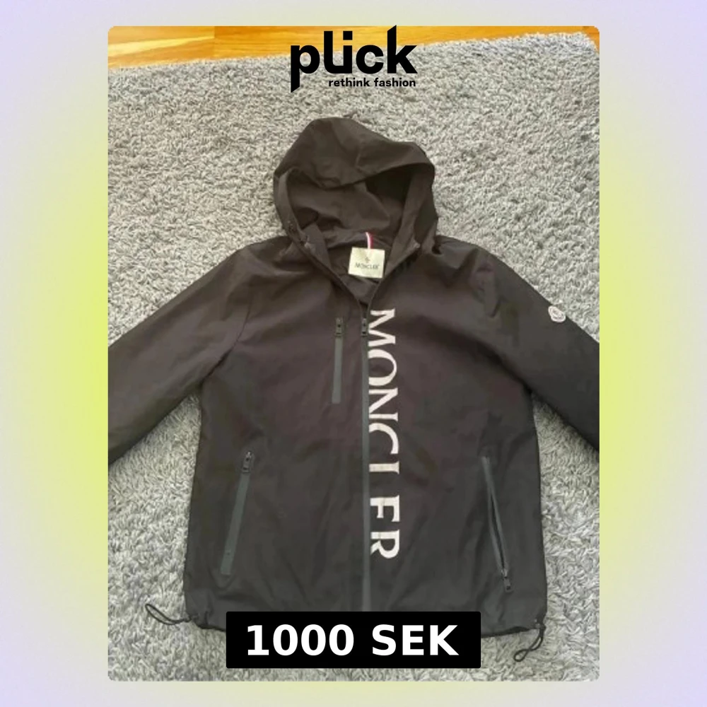 Snygg svart vindjacka från Moncler med stor logga längs dragkedjan framtill. Jackan har huva, tre dragkedjeförsedda fickor och justerbar nederkant. Tillverkad i lätt och tåligt material, perfekt för blåsiga dagar. Klassisk Moncler-patch på ärmen.
