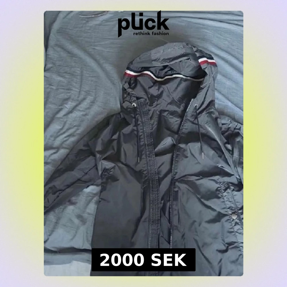 Snygg svart vindjacka med dragkedja och huva. Jackan har vita och röda detaljer på huvan samt justerbara snören. Tillverkad i ett glansigt, vindtätt material som passar perfekt för blåsiga dagar. Storlek 1 enligt etiketten.