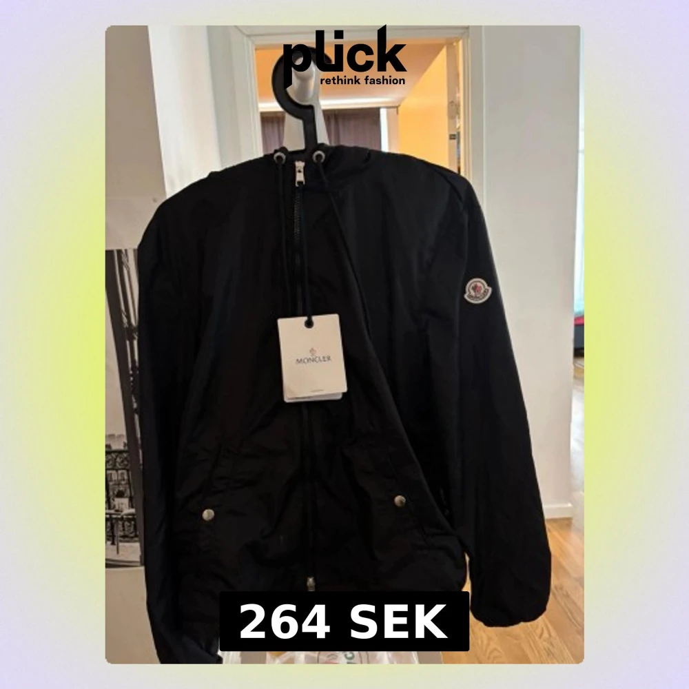Snygg svart vindjacka från Moncler med huva och dragkedja framtill. Jackan har två fickor med tryckknappar och Moncler-logga på ärmen. Perfekt för blåsiga dagar och enkel att matcha med olika outfits.