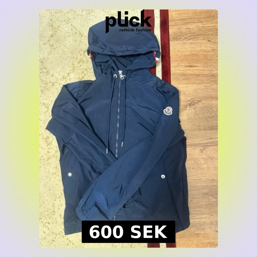 Snygg mörkblå vindjacka från Moncler med huva och dragsko. Jackan har silverfärgade detaljer, två sidofickor med tryckknappar och Moncler-logga på ärmen. Materialet är tunt och vattenavvisande, perfekt för blåsiga dagar. Röd, vit och blå rand på huvan ger extra stil.