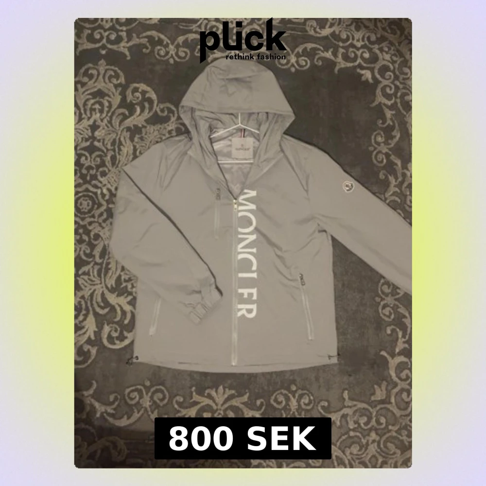 Snygg grå vindjacka från Moncler med stor vit logga framtill. Storlek S men passar också bra med M